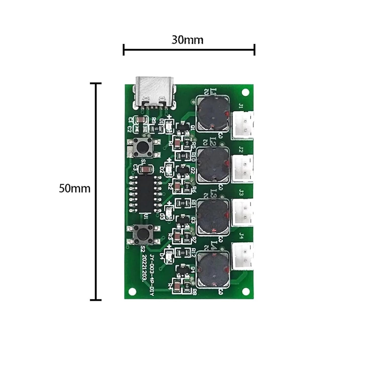 Sensor BlocksModel: four spray atomization driving plateRated voltage: DC 5vAtomization frequency: 108KHZ ± 2KHZRated current: 300MAMaterial: 1.2mmFR-4Power: 2.5-3WPCB size: 50 * 25 * 1.2mmAtmosphere lighting: white lightPress S1 switch for the first time in four consecutive spray modesFour nozzles are in continuous spray mode, four LED lights are always on, and spray will be automatically shut down for protection after 2 hoursContinuous four spray modePress S1 switch for the second shutdownDynamic spray mode (press S1 to start up first) Press S2 switch for the first timePress the first time, dynamic spray, spray for 3 seconds at No. 1 mouth, and the light should be on; Spray for 3 seconds from the second second at the entrance 2, and the light should be on accordingly;Spray for 3 seconds from the 3rd second at the 3rd entrance, and the light should be on accordingly; Spray for 3 seconds from the 4th second at Entrance 4, and the light is on accordingly; In the 5th second, spray at No.1 mouth for 3 seconds, and cycle in turn.In indirect spray mode, press S2 switch to turn on No. 1 spray for the second time, and the light will be on; Press the S2 switch for the third time1 # and 2 # spray, the light should be on; Press the S2 switch for the fourth time1 #, 2 #, 3 # spray, the light should be on; Press S2 switch on for the fifth time1 #, 2 #, 3 #, 4 # spray, light corresponding light on, press S2 switch for the sixth time to S2 start function, the above functions will automatically shut down within 2 hoursTurn off and press S1