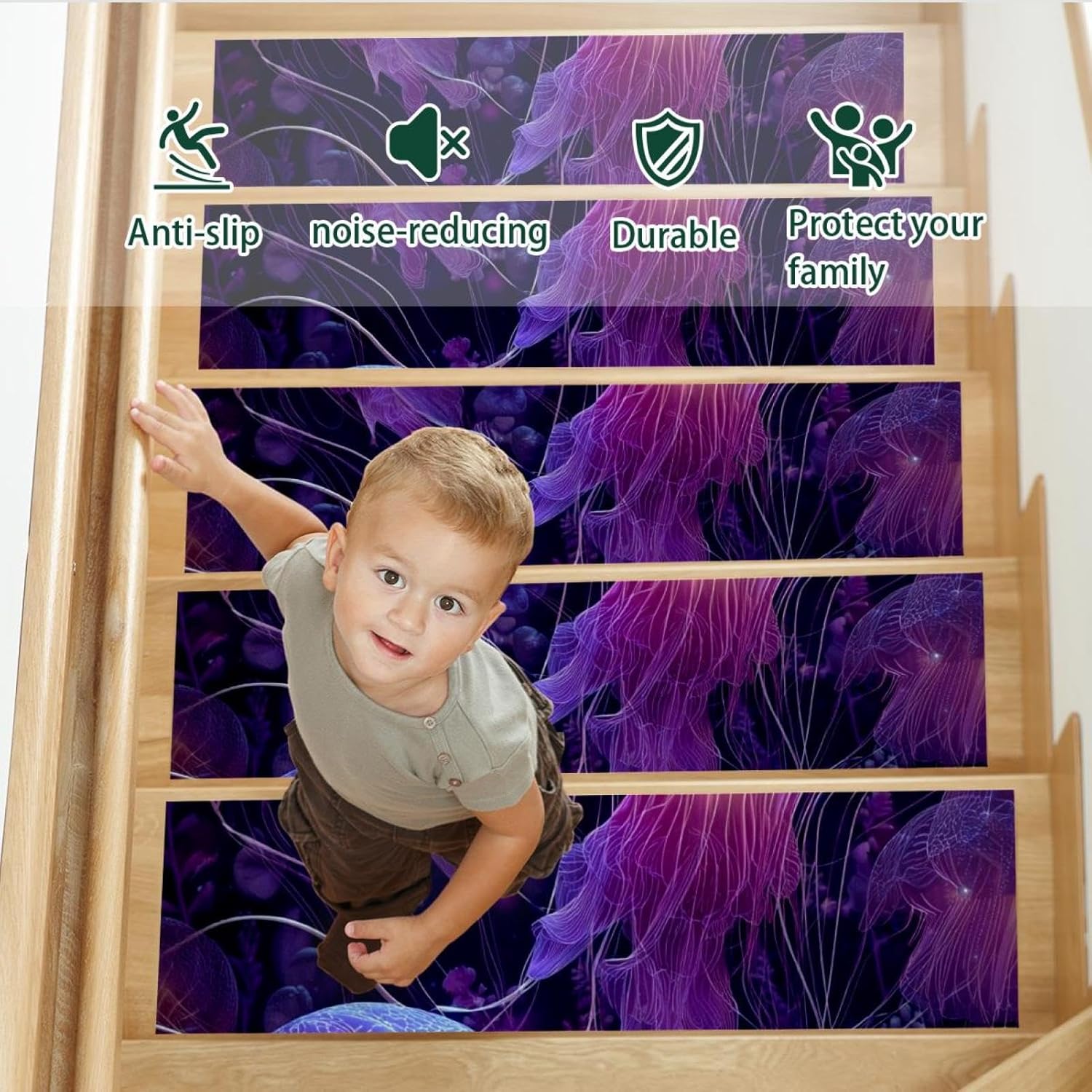 ・Size: 30 x 8 in / 76 x 20 cm, 5 mm thickness. ・Material: The polyester surface absorbs water, preventing stains on the floor. The TPE back is non-slip and water-resistant, preventing damage to the stairs. ・Package Contains: 15 pieces of 30x8in (about 76x20cm) stair mats, 5mm thick. Suitable for most needs. Each stairway treads rugs is individually wrapped. ・Easy to Clean: Vacuum, hand wash or machine wash. The stair runners for wooden steps can be machine washed, preferably hand washed, or vacuumed. Do not use bleach or tumble dry at high temperatures, drying at appropriate low temperatures will give you a comfortable texture. ・Noise Reduction of Stair Treads: By adding our stair runner, not only can you protect your floors, but you can also significantly diminish the noise caused by walking up and down the stairs. Stair rugs can decorate your stairs, create a warm home atmosphere, you can enjoy a peaceful and quiet home environment without disturbances. ・Easy to Remove Adhesive Backing: When you want to replace the stair treads non slip, the adhesive backing easily removes without leaving residue on the steps. ・Holiday Design: Stair carpet treads are designed specifically for Christmas,Halloween, Thanksgiving Day features classic festival elements and vivid printing styles,creating beautiful and stunning visual effects for you. This holiday themed stair treads can easily help you add a strong festive atmosphere, bringing charming and exquisite holiday decorations.