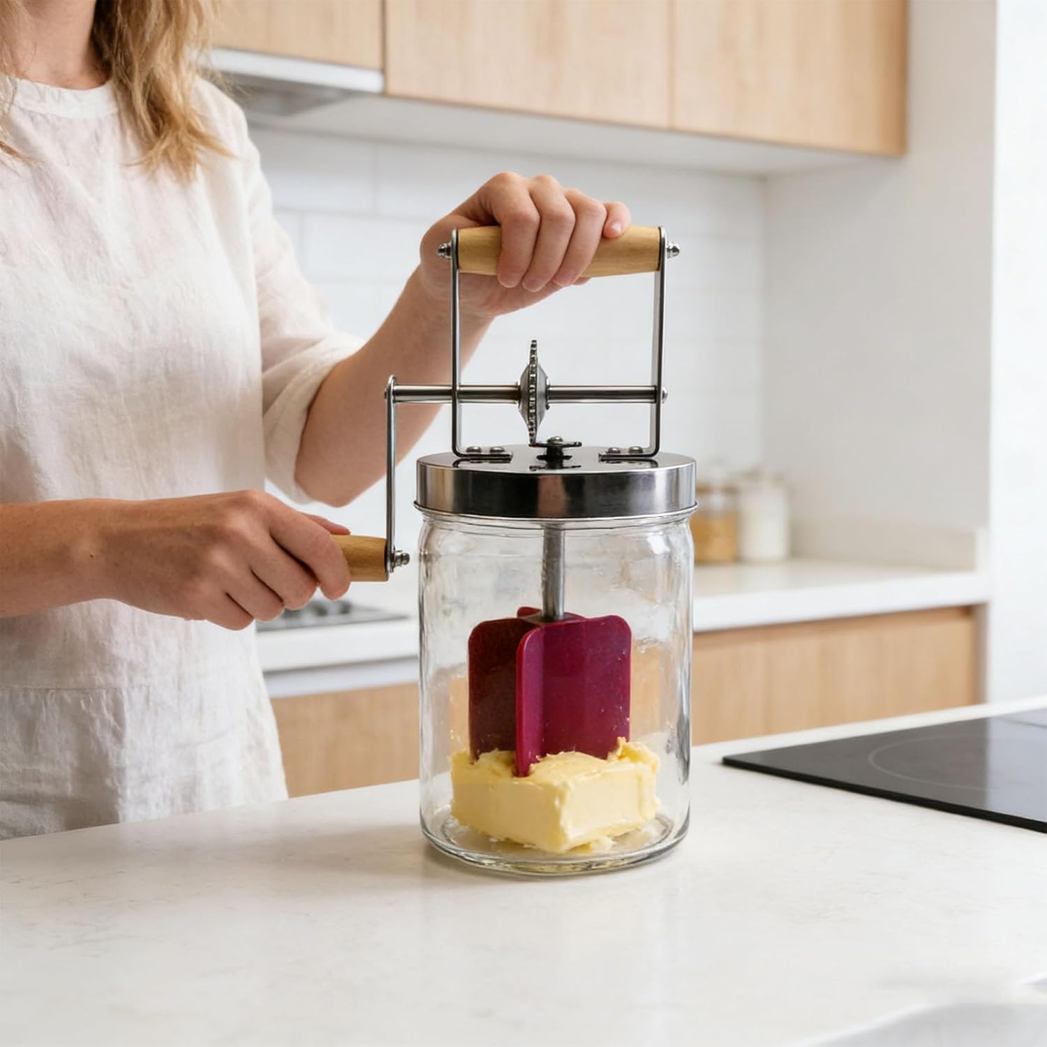 1500ml Glass Butter Churn With PP Lid For Homemade Butter And Cream Mixing Easy To Use Kitchen Tool Features: Homemade Butter Maker: Add rich dairy cream into this 1500ml butter churn container and process for 10 15 minutes to prepare wholesome, handcrafted butter with authentic traditional taste Practical Strainer Top Feature: Includes built in filtering lid to easily separate liquids from your homemade butter without additional tools ideal for handicraftsman butter enthusiasts Enhanced Gear Mechanism: Contains reinforced drive components for smoother turning and efficiency while protecting hands during use Construction: Made with premium glass and PP materials for long lasting use ( hand washing recommended; avoid with boiling water) Versatile Kitchen Tool: Great for making butter, mixing creams, preparing blends, and various cooking tasks a must have multi functional item for cooking lovers Specifications: Substance: glass+PP Size: Capacity 1500ml Practicality: It is specially designed for stirring butter, cream and other cheese ingredients It is simple to operate and suitable for daily baking and cooking needs Package Includes: Butter churn×1 Note: Before using the accessory, please check it is compatible Pay attention to the storage methods