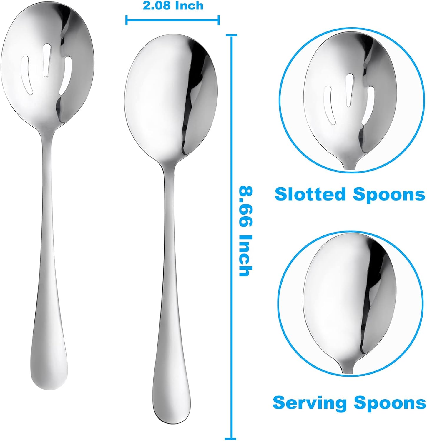 Package Included: Serving Spoons and Slotted Spoons. Multi Design Fits Various Purpose -Large face allows them picks up food more than regular spoon. -Slotted face is for removing canned fruits from sugar syrup,vegetables, ice cubes from drinks, and foods from sauces. Simple and Elegant Stainless Steel Flatware Set -They have nice weight to feel good in your hand, rounded edges and smooth. -You can use it for weddings, dinners, banquets, buffets or various evening parties -Easy to clean and store, great for daily use or as a gift.