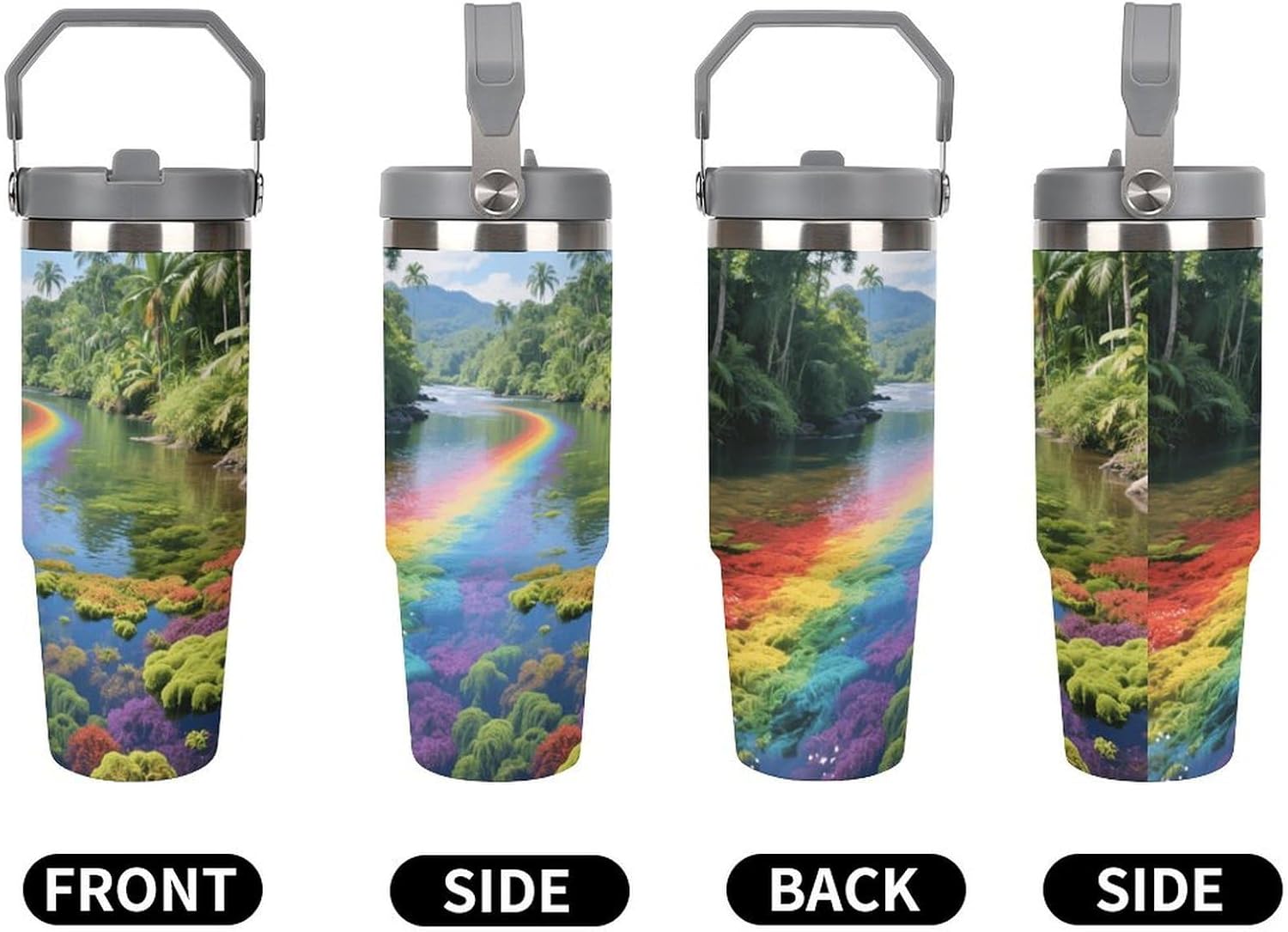 Whether you're on a long drive, a busy commute, or an outdoor adventure, staying hydrated is crucial. Our large-capacity car tumblers featuring the Rainbow River Landscape pattern were developed with this need in mind. They're the perfect solution for on-the-go hydration, ensuring a smooth and comfortable journey. With an impressive 30-ounce capacity, this insulated stainless steel travel tumbler easily meets your frequent hydration needs, from your morning commute to your after-get off work workout or even a full-day road trip. Without constantly searching for water, you can focus on the road ahead and say goodbye to thirst. Whether you're sweating it out on a scorching summer day or sweltering in your car on a dry winter night, staying hydrated helps you perform at your best. We understand your appreciation for quality and aesthetics, and our car tumblers feature unique designs that complement any vehicle's interior, exuding understated elegance. More than just a practical tool, they're the perfect finishing touch, adding a touch of style to your vehicle's interior.