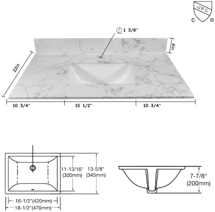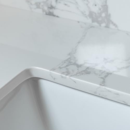 The vanity tops are made of beautiful Engineered stone. All exterior sides are polished for a luxurious look. Each model is complemented with a ceramic Rectangle undermount sink. The matching backsplash is included in each package. DIMENSIONS Exterior Dimension: 31 wide x 22 deep Fits Most Standard 30-in W x 21-in D vanity cabinet 4 inches center faucet holes Material:Enginnered tone Stone top Size:31X22x3/4 inch Elegant & Stylish Top: Warmly elegant and stylish Carrara marble vanity top complement most Bathroom designs and coordinate with both light and dark cabinetry High-end and classic natural stone top Pre-sealed and Polished for added protection Easy to Installation:Top pre-drilled for 8-inch widespread faucet Assembled stylish rectangular white vitreous china under mount bowl with safety overflow hole This top is perfect for quick and easy remodels Obtain the beauty and durability of marble without hiring a professional PACKAGE INCLUDED:Vanity top with assembled rectangular under mount bowl matching 4high Backsplash Besides extremely solid package - very firm carton box with foam is used to transport top making sure a safe delivery (Attention) Faucet and side splash NOT included.