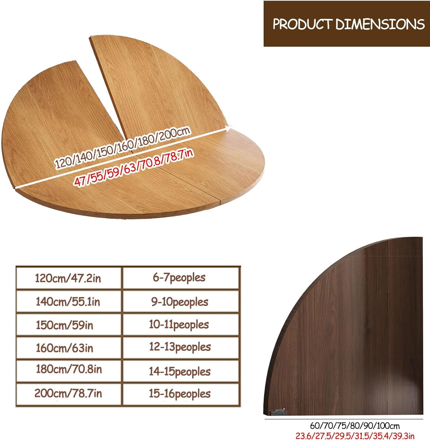 This Compact And Space-Saving Wood Tabletop Features A Quarter-Circle Folding Design, Perfect For Easy Use And Storage. Its Sturdy Fixed Buckle Ensures Stability During Use And Folds Away Neatly When Not Needed. Ideal For Parties Or Dinners, It Provides Extra Table Space To Accommodate More Guests Effortlessly. Simple To Install And Versatile!Product Name:Foldable Round Table TopMaterial:Solid Wood MultilayerColor:A,BDiameter:120cm/47.2in , 140cm/55.1in , 150cm/59in , 160cm/63in , 180cm/70.8in , 200cm/78.7inThickness:1.8cm/0.7inCapacity:120cm/47.2in:6-7 Persons140cm/55.1in:9-10 Persons150cm/59in:10-11 Persons160cm/63in:12-13 Persons180cm/70.8in:14-15 Persons200cm/78.7in:16-17 PersonsPackage:Foldable Round Table Top X1Attention:1. It is recommended to place this foldable tabletop on a round or square table to ensure structural stability; if placed on a rectangular table, additional support legs are required.2. This product includes only the tabletop, which can be placed on table legs or directly on another tabletop.3. Please allow for slight color differences due to lighting during photography and 1-3cm measurement errors due to manual measurement. Please refer to the actual product.4.When Using, If The Support Surface Is Small, Please Add Support Columns To Ensure The Stability Of The Table Top.