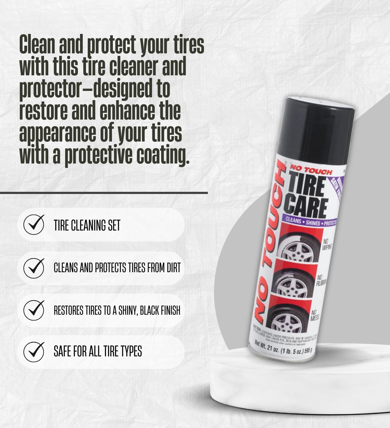 No Touch Tire Care Tire Cleaner/Protector is a convenient one-step solution that combines tire cleaning and dressing in a single application. Designed with a patented foam formula, it lifts surface dirt and applies a conditioning layer that enhances the look of tires while helping to prevent cracking and fading. The product dries to a satin-black finish, offering a clean, natural appearance without oily residue or sling. Unlike traditional tire shine products that may require manual wiping or repeated applications, No Touch works by simply spraying directly onto clean, dry tire sidewalls. The foam spreads evenly and dries on its own, saving time while leaving behind a protective barrier that helps repel water, dust, and road grime. This tire coating is ideal for maintaining the appearance of tires while reducing surface wear caused by sun and weather exposure. This gift set includes four 21 oz cans of No Touch Tire Care Tire Cleaner/Protector and one microfiber cloth. The included cloth can be used to clean surrounding wheels, catch overspray, or buff tires after application. Whether you're maintaining your personal vehicle or detailing multiple cars, this tire care set supports easy, mess-free maintenance with long-lasting visual results.