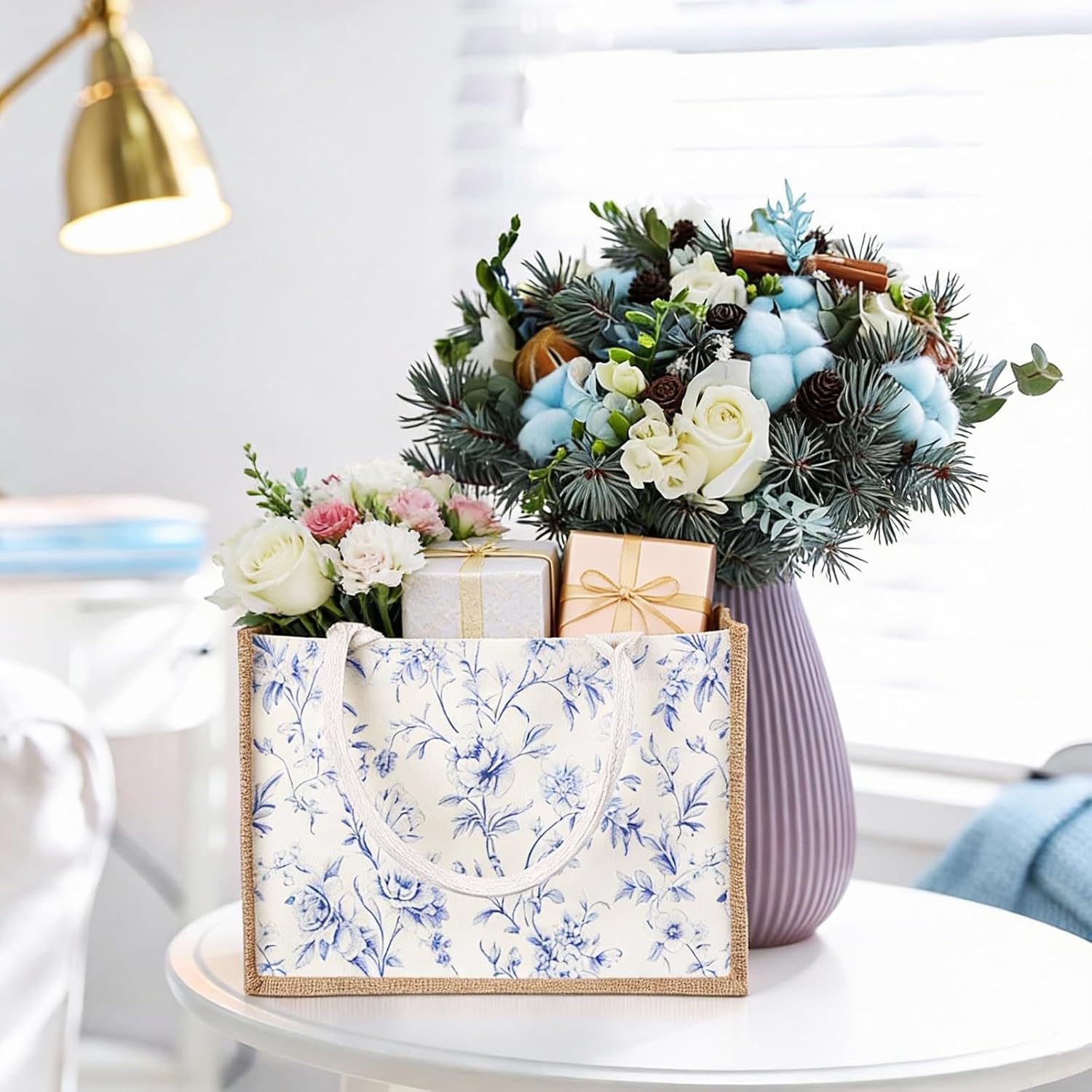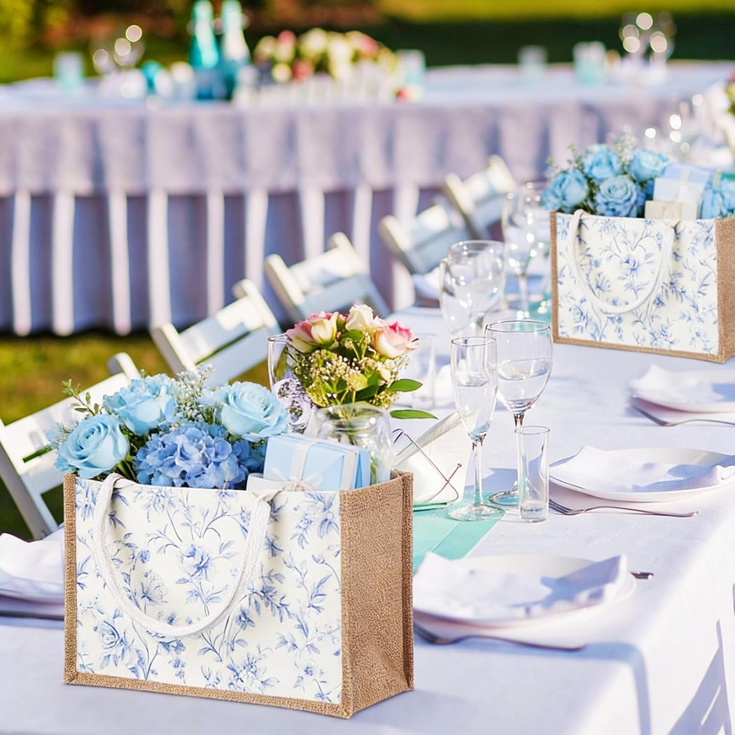 6 Pcs Floral Burlap Tote Gift Bags with Handle Reusable Bridesmaid Jute Waterproof Grocery Bags for Wedding Party(Something Blue)