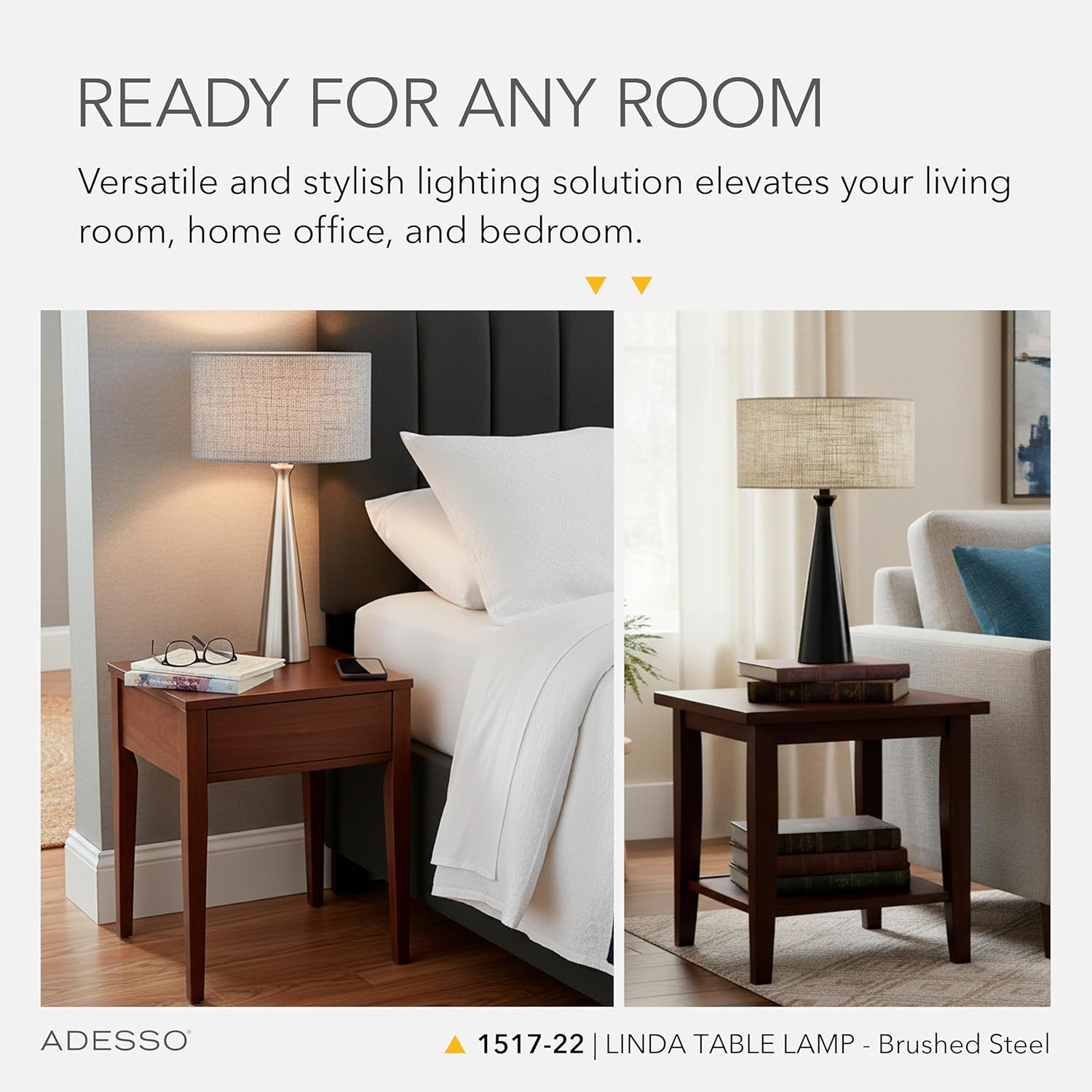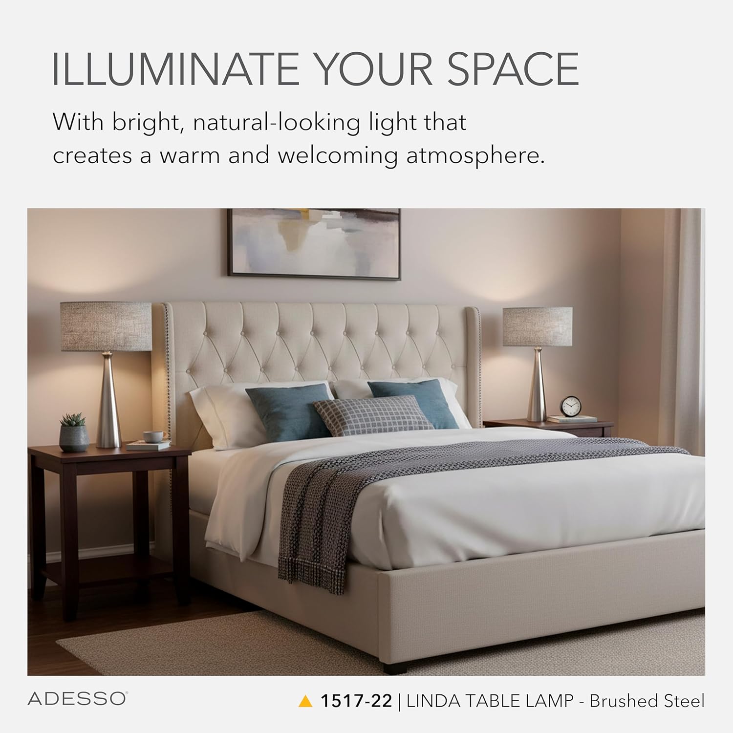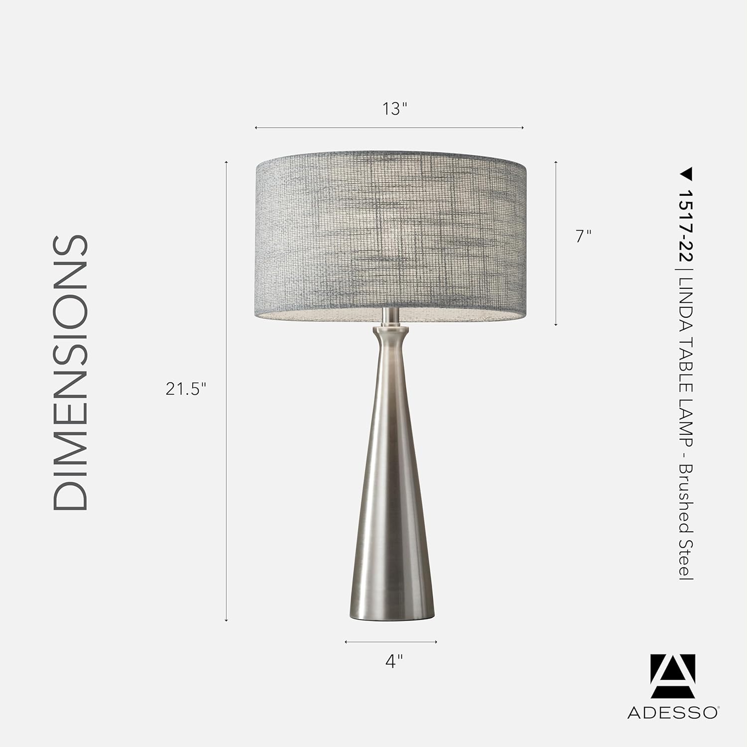 A smooth, tapered base with a brushed steel finish beautifully reflects the light shining through a light grey textured fabric shade. The Linda Table Lamp is the perfect size for a desk or side table. A 3-way rotary socket switch will only work with a 3-way light bulb, otherwise this lamp will function with simple on/off switch at its highest setting. This table lamp has a clear cord and is smart outlet compatible. Bulb is not included.