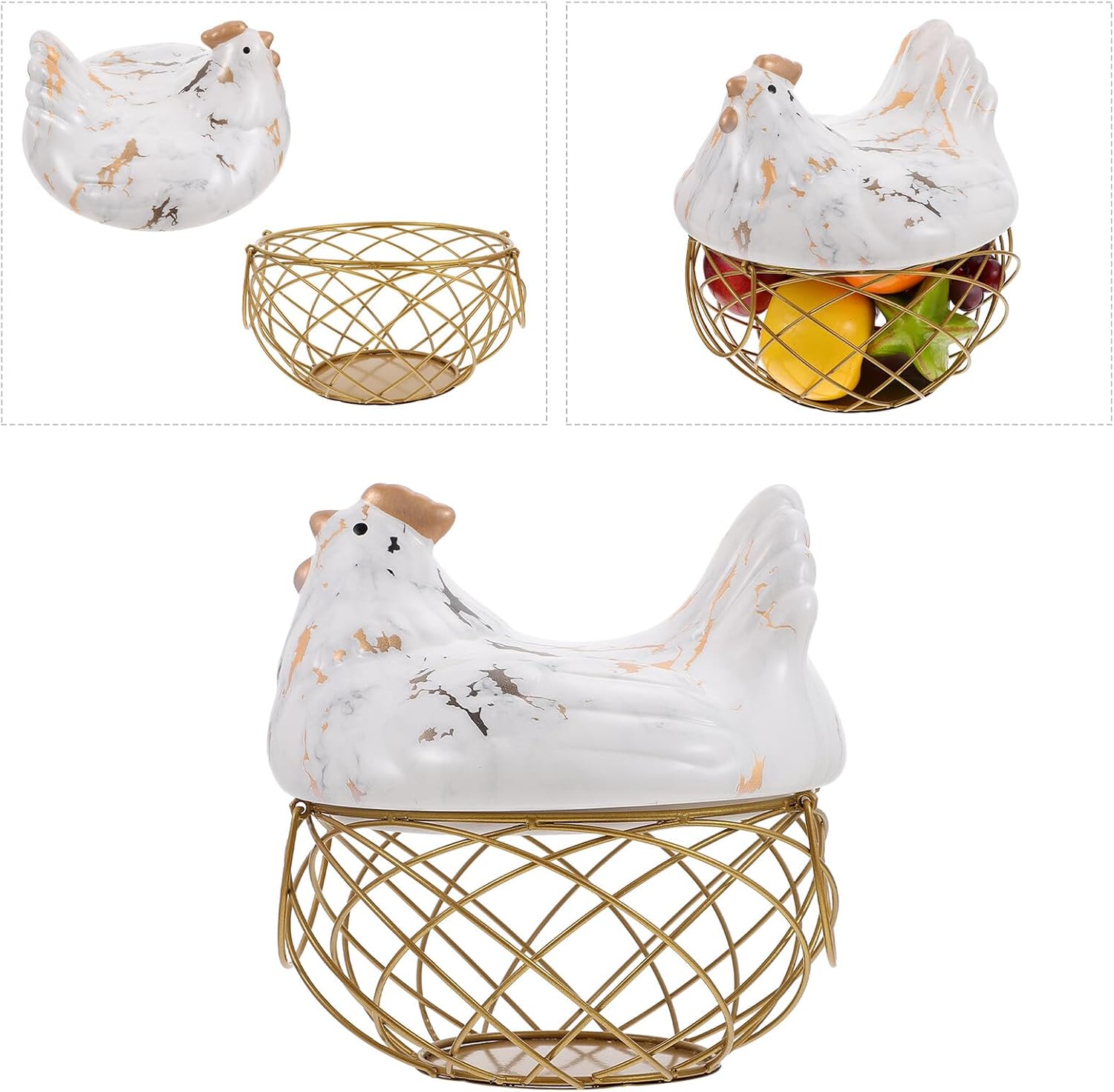 Package List 1 x Storage Basket Characteristics -Product Info:Wrought iron storage basket -Material: Ceramic, iron. - Country style design, make your home have a natural and rural atmosphere, decorative and practical eggs basket. - Practical and convenient, the mesh basket allows you to take the eggs you want out Home Iron Egg Holder. - A hen perches on a wire basket, which is an interesting and practical way to store eggs. fresh egg holder - Used to store eggs, fruits and other foods, it is an essential helper in the kitchen egg storage basket for countertop. - This iron mesh basket with a hen lid is a work of art and a good decoration for the kitchen egg basket.Goods Informationfruit storage basket Decorative and practical storage basket for you.egg basket for gathering Perfect for storing and organizing your food.egg storage container Do you want to have a multi-functional storage basket? Then, you miss our storage basket, using iron and ceramic material of