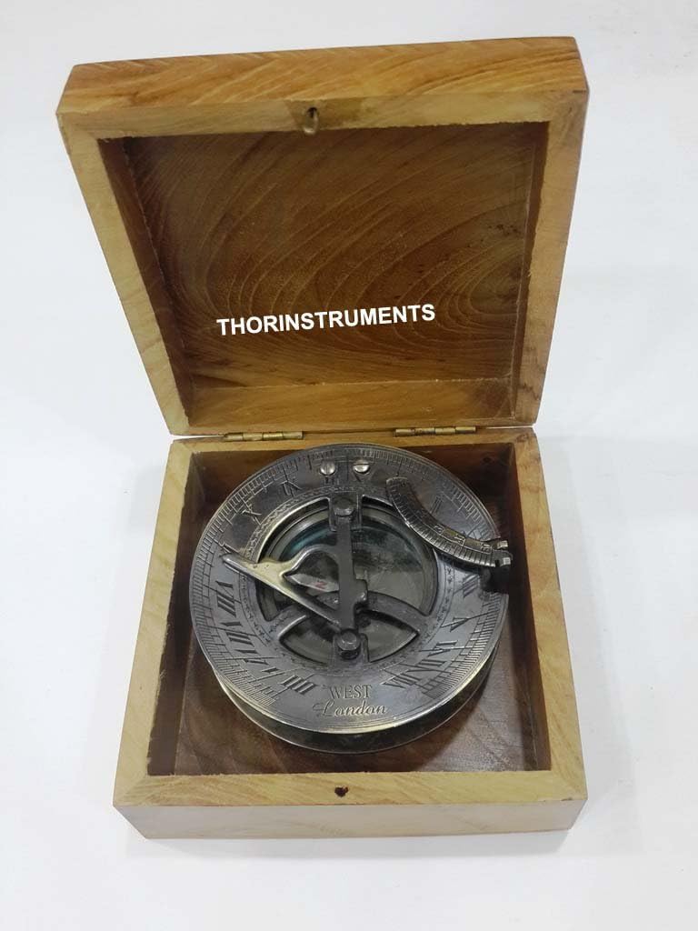 Its a sundial compass is a combination of these two instruments, consisting of a portable sundial which is attached over a compass via a hinge. There are some adjustable legs that need to be used to level the instrument if not on level ground. The gnome is hinged and needs to be put in the up position where it locks into place. There should be what looks like a protractor that is to the right of the gnome that is on a hinge, and this needs to be flipped up as well. The protractor is used to set the sundial to the correct latitude angle, while the compass is used to find true north based on the area’s magnetic north declination. Once your sundial compass has been leveled, set to the correct latitude, and to true north, a shadow will be is cast onto the sundial’s face by the gnome. For use in the southern hemisphere, the same procedure is followed with the exception that true South must be found instead of true North.