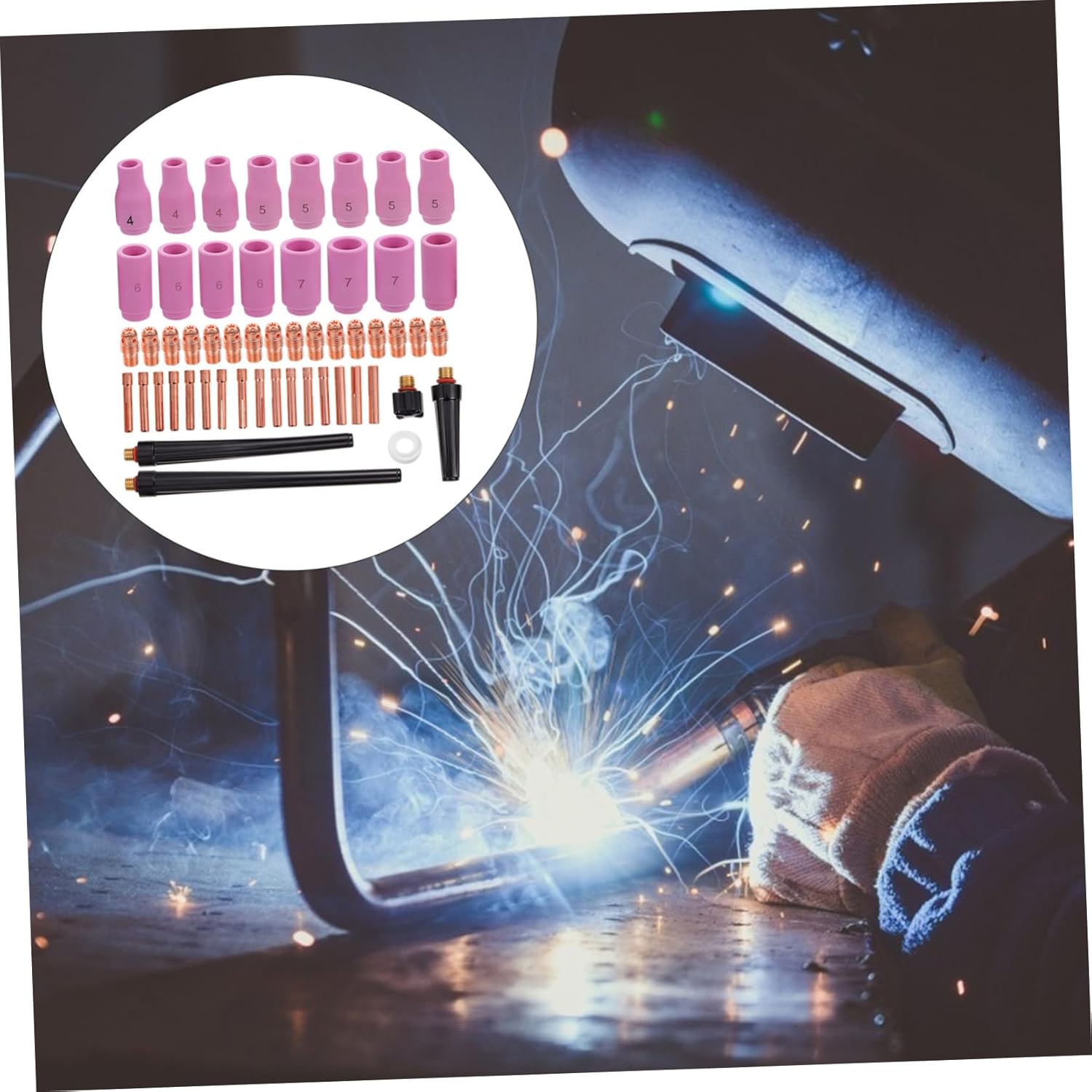 Package List 1 x Set of 53pcs Welding Torch Accessories Characteristics - Color: As Shown Welding Nozzle - Material: Copper, Ceramic Welding Torch Parts - Size: About 15.00X1.50X1.50cm/5.89X0.59X0.59in Welding Torch Kit - Made of copper, ceramic and plastic material, it has high efficiency and Holders. - These products are as plasma cutting consumables, they are essential to plasma cutting project Argon Arc Welding Parts. - It helps to make uniform gas flow for welding which can help to weld to high Argon Arc Protective Nozzles. - It features , resistance, and durability Clips. - It gives welders an extraordinary visibility and comfortable feeling during the welding work Welding Kit.Goods InformationWelding Kit A nice choice for argon arc welding.Welding Torch Kit The precise design will ensure its practicability in the work of highly performance.Ceramic Nozzle for 9 It's easy to use and install with . Clamp These items include 53pcs with the lowest burn-loss rate