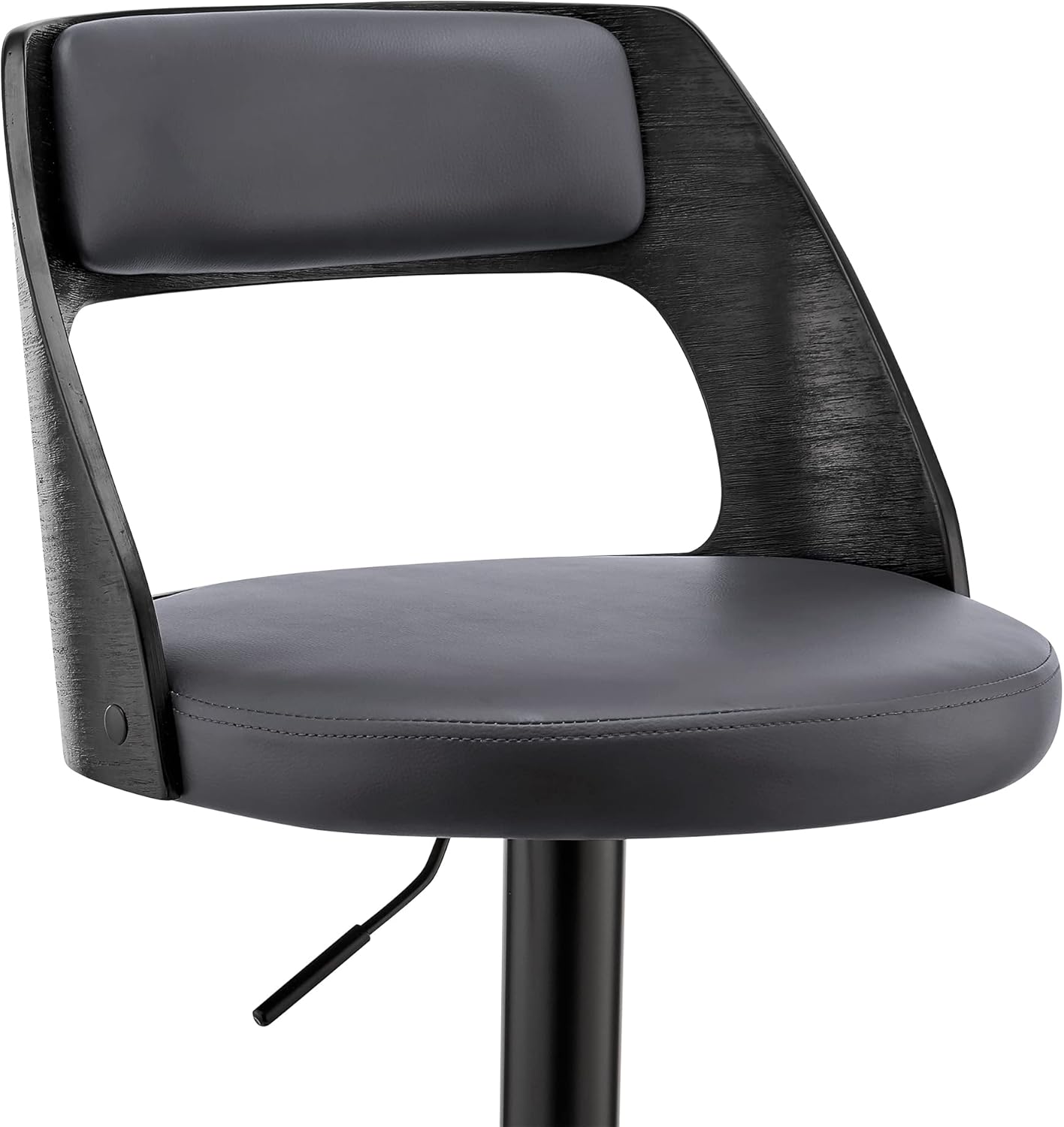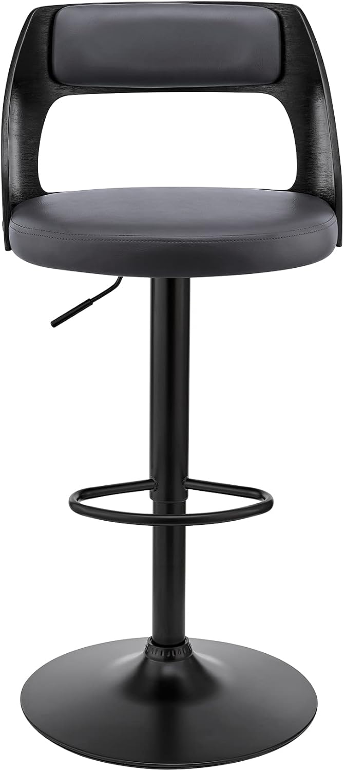The Paulo Adjustable Swivel Gray Faux Leather and Black Wood Bar Stool with Black Base is the ideal addition to any home or apartment. The wide seat and ergonomic design are capable of keeping you comfortable and relaxed as long as you like. This stool combines mid-century aesthetics with a dash of retro chic glamour. The adjustable seat height functionality allows you to use this stool at your kitchen island, home bar, or peninsula without having to worry about the surface height. The convenient swivel function optimizes everyday use or entertaining, keeping everyone engaged regardless of their place in the room. The plush padded and high-density foam seat and back rest atop a strong pedestal base that creates a sturdy and comfortable seating experience. The Paulo is available in your choice of cream or black faux leather with walnut wood and a chrome base or cream or gray faux leather with black wood and a black base.FeaturesProduct Dimensions: W: 19 x D: 19 x H: 36 - 44 x Seat H: 25 - 33Adjustable Height: Utilize the easy-to-use lever right below the seat to adjust to your preferred heightSwivel Function: Smooth glide swivel function allows you to change directions with easeColor Preferences: The Paulo is available in cream or black faux leather with walnut wood and a chrome base or cream or gray faux leather with black wood and a black baseStable and Sturdy: Large base prevents any rocking or movement caused by swivel or height featuresSimple Assembly: Clear step-by-step instructions ensure quick and easy setupQuality Assurance: Armen Living proudly provides 1-year limited manufacturer warranty for your peace of mindDimensions:Bar StoolAssembled Product: 19 inches wide x 19 inches deep x 36 inches highSeat Width: 18 inchesSeat Depth: 16 inchesSeat Height: 25 inchesCushion Thickness: 2 inchesBack Height: 11 inchesMax Height: 44 inchesMin Height: 36 inchesWeight Capacity: 250 poundsArmen Living leads in modern furniture design and manufacturing, providing end-to-end solutions globally. We exceed client expectations with speed and flexibility, delivering exceptional products with reliability and innovation. Based in Southern California, our distribution center serves retailers, designers, and hospitality providers worldwide. Offering a wide range of designs, including originals, we're a trusted resource for stylish modern furniture, committed to quality and customer satisfaction.