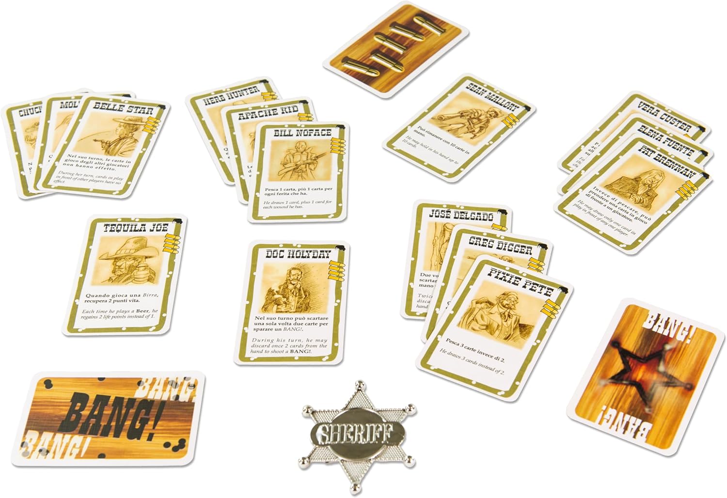 Product Description A thrilling blend of hidden roles, bluffing, and dramatic shootouts, BANG! by DV Games brings the Wild West to life through fast turns, unpredictable twists, and lively table interaction. Players secretly assume roles with unique goals that shape alliances, deception, and tactical choices every round. High Noon events add fresh hazards and shifting conditions that challenge players to adapt as the chaos escalates. Dodge City characters and expansions introduce new abilities, card interactions, and strategic layers that keep every game exciting, thematic, and full of unexpected turns. With accessible rules, quick setup, and memorable social moments, BANG! delivers a dynamic tabletop experience for families, hobby gamers, and fans of deduction games. Whether protecting the Sheriff, striking back as an Outlaw, or scheming alone as the Renegade, every decision influences the outcome and drives the tension of the showdown. Its mix of variable roles, replayable scenarios, and expanding content ensures that no two plays feel the same, creating a highly interactive narrative that keeps groups returning to the table. BANG! is both a strategic challenge and a lively social showdown that rewards clever play, bold risks, and quick thinking. From the Manufacturer Since the beginning, the Outlaws hunt the Sheriff, the Sheriff hunts the Outlaws. The Renegade plots in secret, ready to take one side or the other. But who are the merciless Outlaws, willing to gun him down? To find out you have to draw, (Your cards, that is,) Now the Sheriff has decided to settle things once and for all in his own way. He has written a name on a single bullet. That name is... BANG, This special edition includes every BANG, card published to date, and a few new extras, Inside, you will find: BANG, - The basic game, High Noon - The first expansion, Dodge City - The second expansion, A Fistful of Cards - The third expansion Also two new cards for High Noon and three special characters, Plus two blank cards for your own creations, and a special gift: a shiny new Sheriff's badge.