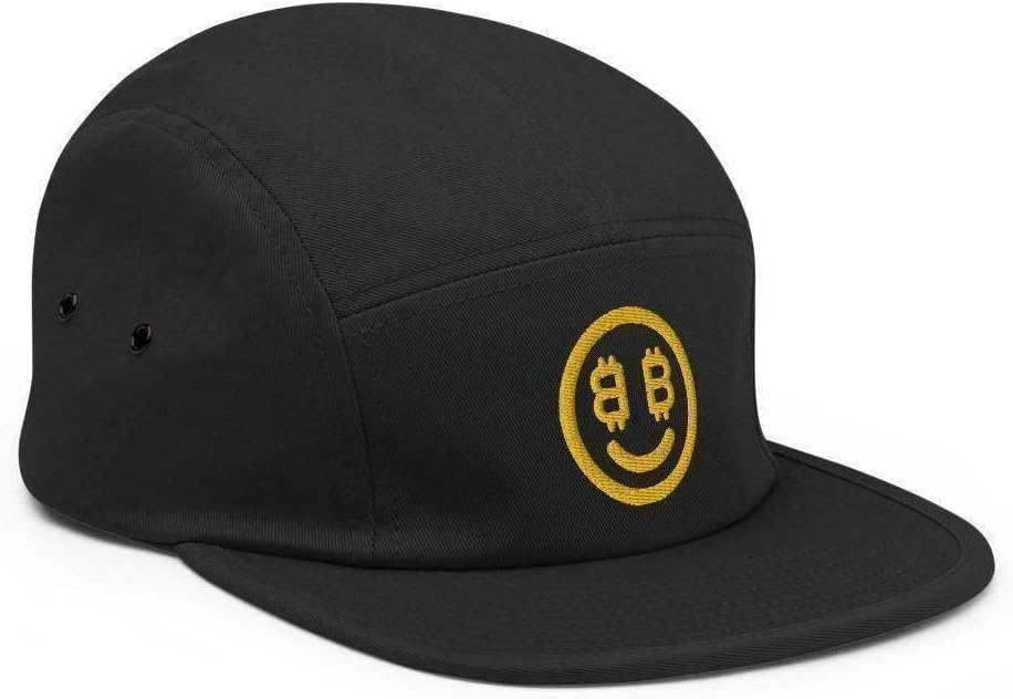 This Bitcoin Smiley camper style cap has a low profile and nylon strap clip closure. Comfortable and classic crypto apparel!Bitcoin Smiley Hat Details: 100% cotton Soft-structured Five panel Low profile Metal eyelets Nylon strap clip closure