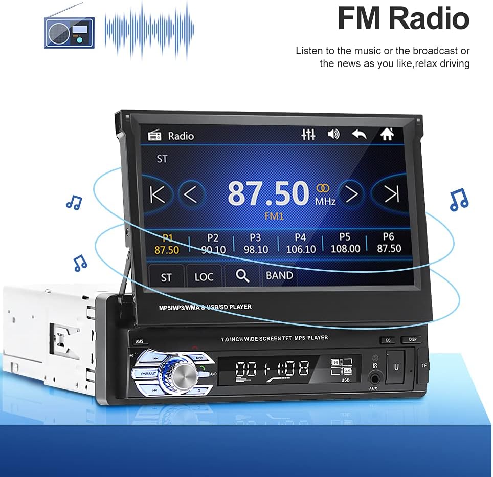 | Additional Features | 7-inch retractable HD screen, Bluetooth, FM Radio, Mirror Link Function, Single Din Car Stereo with 12 led Backup Camera |