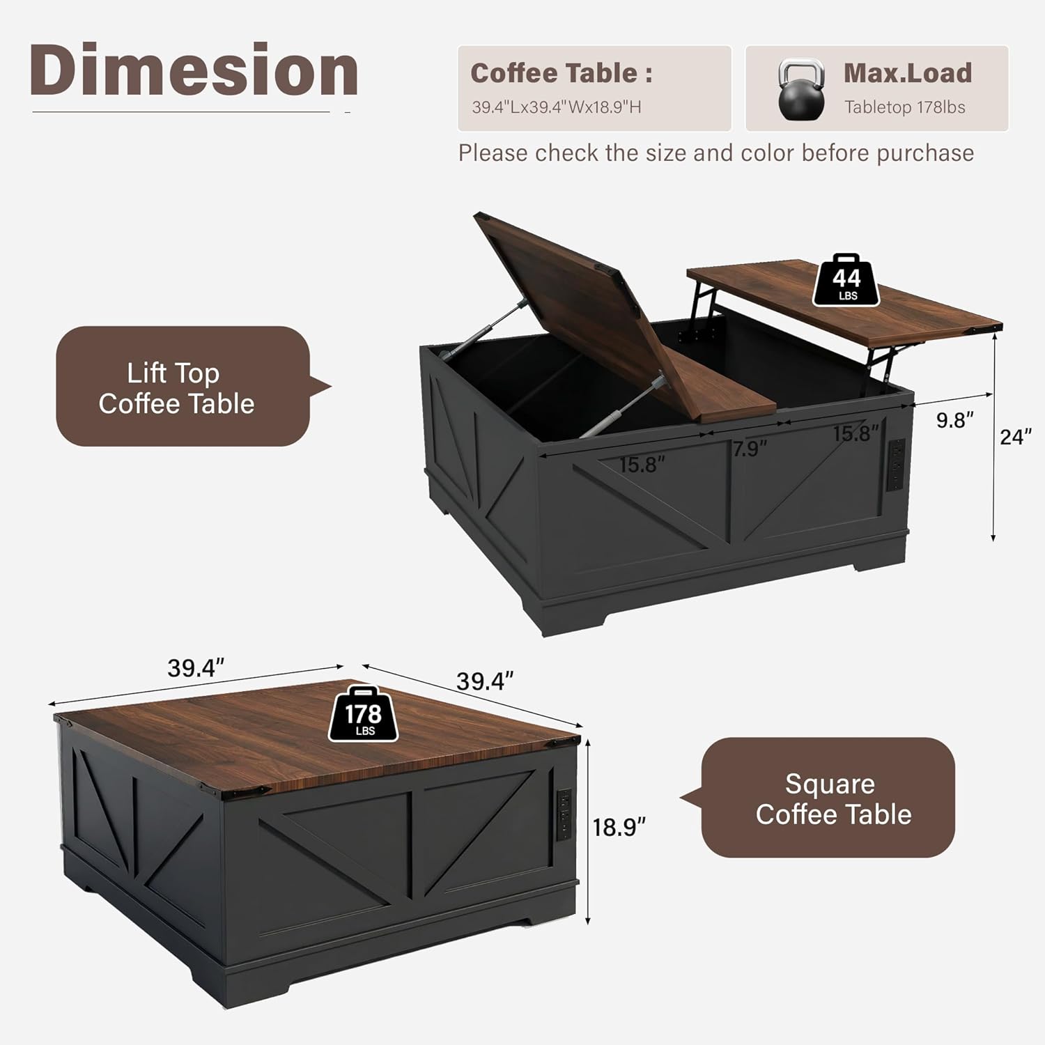 Specifications: Material: MDF Board + Particle Board Color: White+Grey Top/White+Brown Top/Black+Grey Top/Black+Brown Top (Optional) Product Size: 39.4" L x 39.4"W x 18.9"H Load Capacity: 178 LBS Number of Cabinets: 1 Assembly Required: Yes Package including: 1 x Farmhouse Square Coffee Table 1 x Instruction Manual