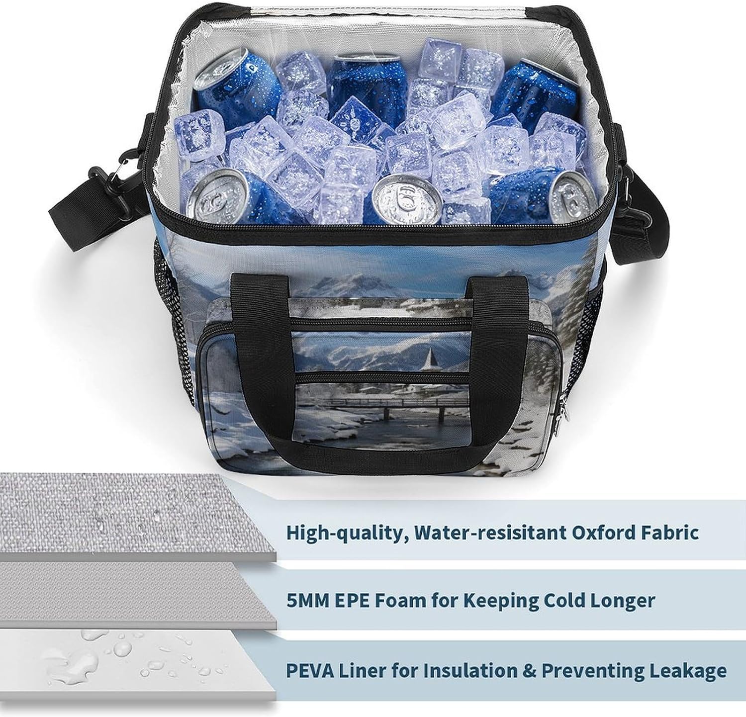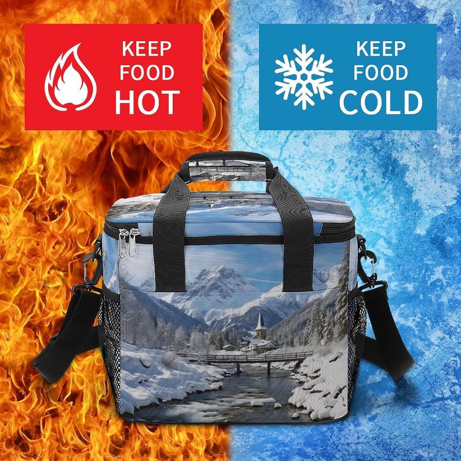Versatile design: The Winter Landscape in The Bavarian Alps print travel cooler bag stylish, gender-neutral design is suitable for all ages and occasions, whether for work, gym, outdoor events, or travel.Perfect for every occasion: This insulated food bag is not just for camping, rugged cooler bag is an excellent choice for everyday use, such as meal prep, lunch at work, grocery shopping, and more.Space-Saving design: The stand-up structure of the outdoor lifestyle bag saves space and makes it easy to store when not in use, insulated grocery bag perfect for compact packing.Machine washable: The reusable lunch bag is easy to maintain, food organizer bag is washable, but avoid prolonged soaking or bleaching to preserve its quality.