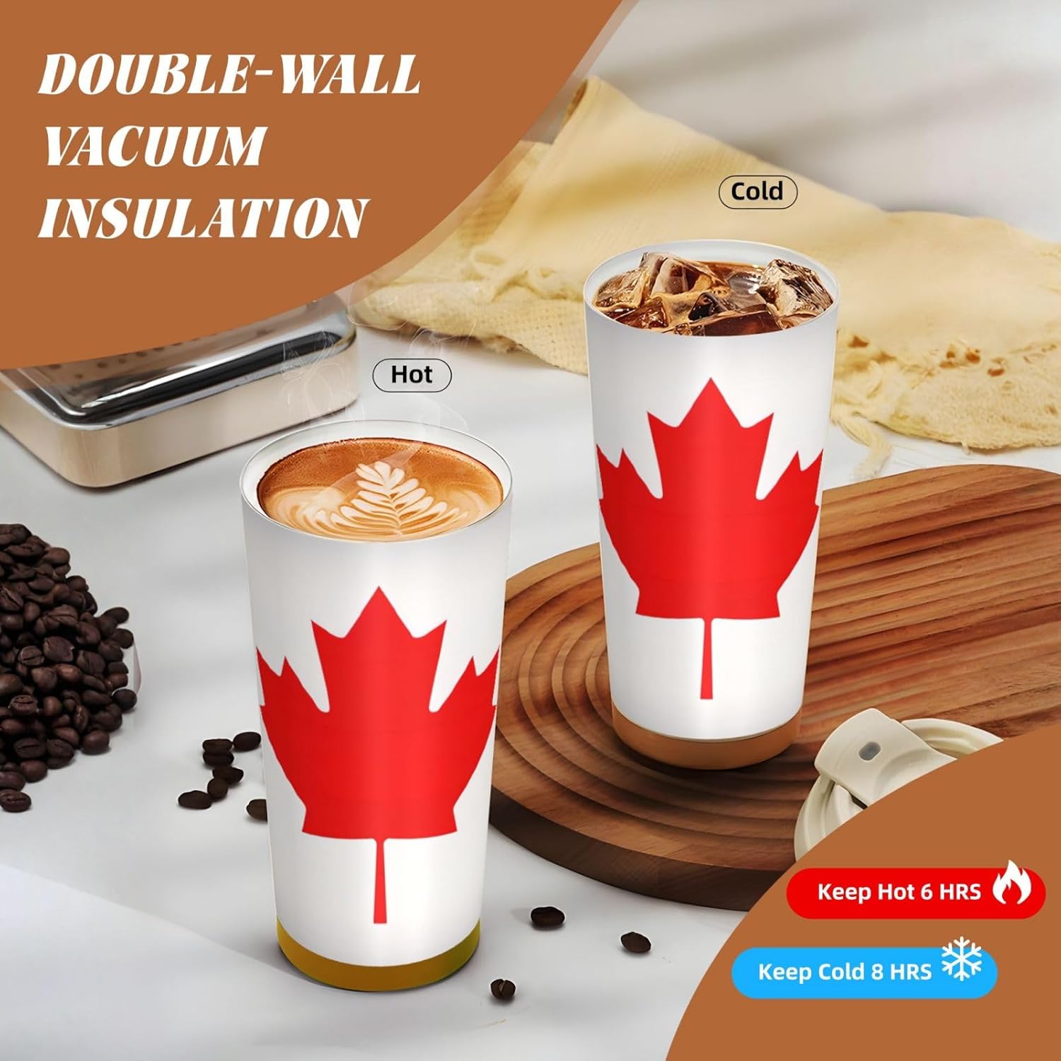 This Canadian flag Print travel Coffee Mug supports three drinking modes: the direct drink spout for quick drinks during commutes, the straw port for iced coffee and other spill prone beverages, and the open top design that replicates the traditional coffee cup experience. BPA Free 316 Stainless Steel, Safe and Durable Inner liner made of food grade 316 stainless steel, non toxic, odorless, BPA free, safe for long term use.