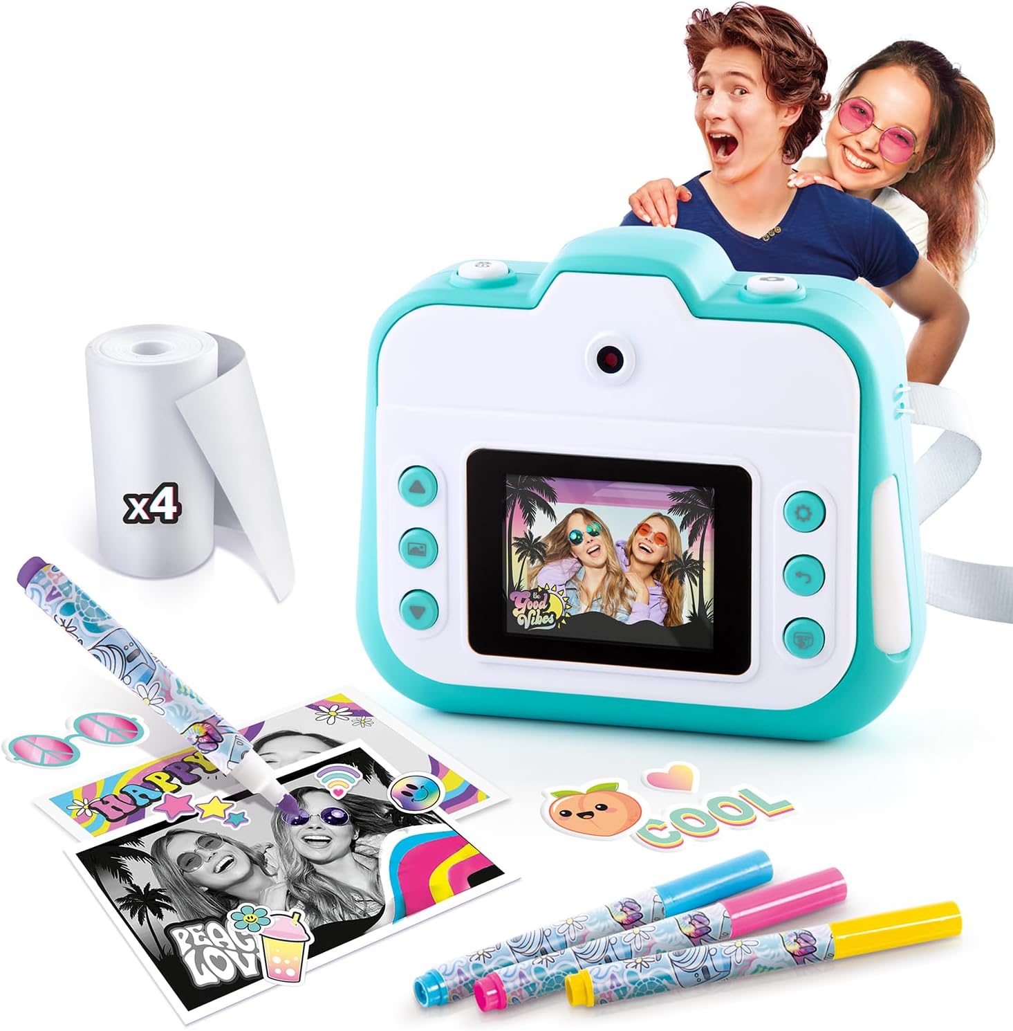 Hours of fun and creativity with this instant digital camera for kids! Take photos and print them instantly. Personalise them according to your wishes with the felt tip pens and stickers included. Very easy to use, printing is done by thermal transfer: no ink and no drying time required. With one click, instantly print your black and white photos. Economical, the thermal paper rolls (guaranteed BPA-free) included in this kit allow you to let your creativity run wild. You can take photos, customise and store memories + 250 photos. In portrait, landscape or selfie mode, you can also select different filters and frames as you wish. Package includes: 1 camera, 1 USB charging cable, 1 hand strap, 4 rolls of thermal paper, 4 felt-tip pens and 1 sheet of stickers. Box Size: W20 x D6 x H24cm Camera Dimension: L13.1 x D4 x H9.5cm Suitable for ages 8+