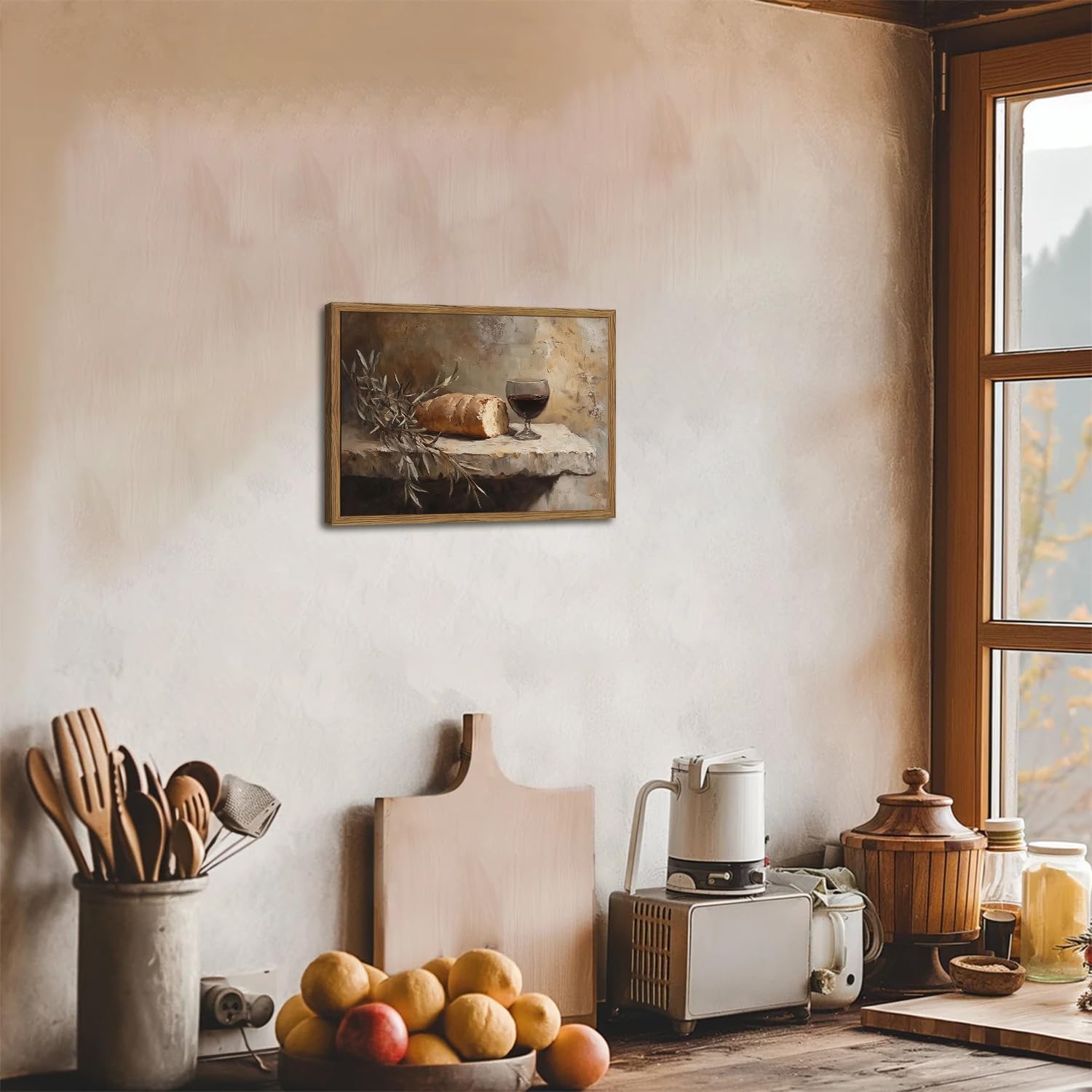 Christian Kitchen Communion Still Life Wall Art Bread and Wine Religion Wall Decor Painting Last Supper Dining Room Poster Canvas Print Cuadro Para Comedor for Farmhouse 16x24 inch Wood Framed