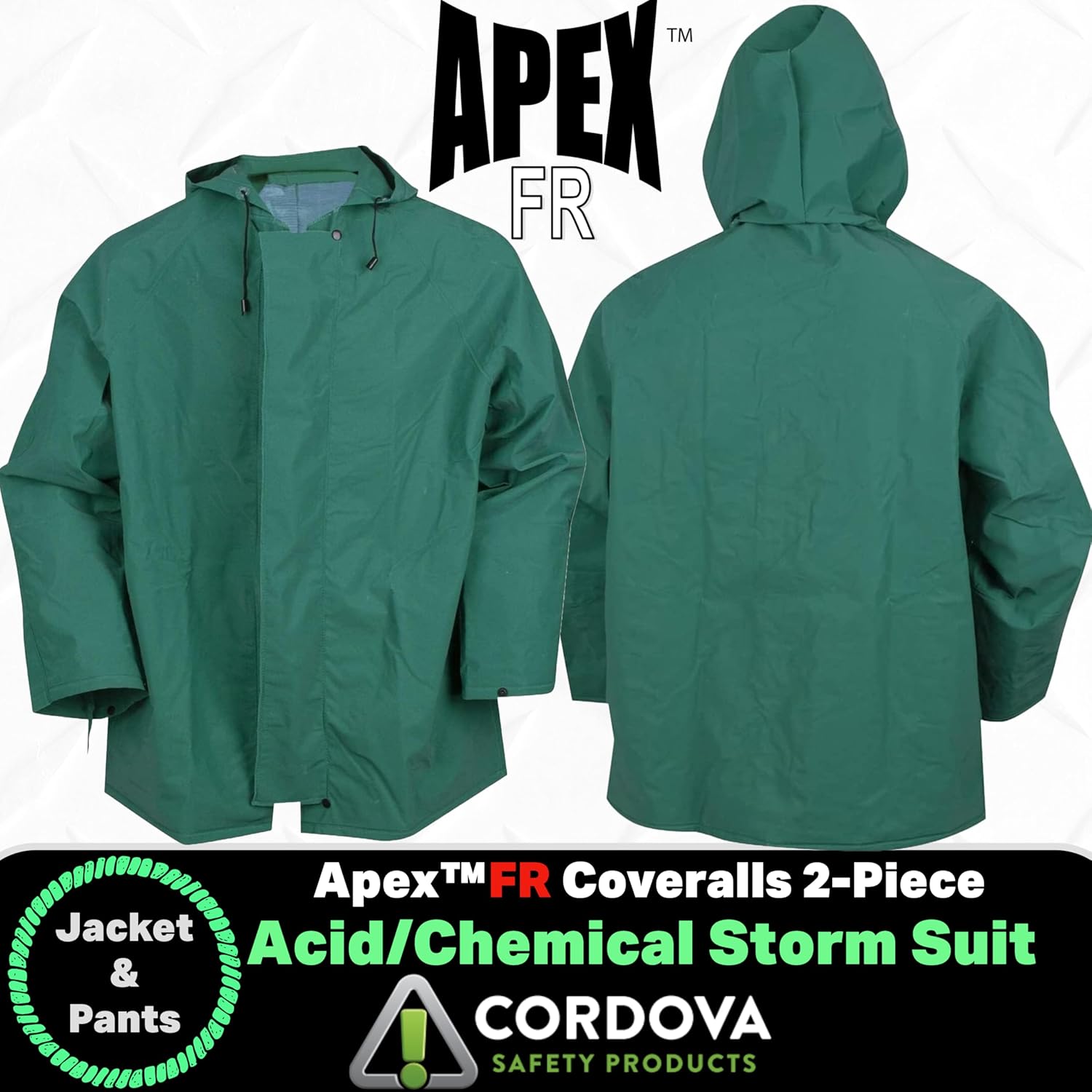 The CORDOVA SAFETY PRODUCTS brandÔøΩ¬†Apex-FR‚ chemical suits are constructed of .45mm PVC/Nylon/PVC fabric and are self-extinguishing per ASTM D6413. They are not designed for arc flash. The 2-piece suits consist of a jacket with attached drawstring hood and bib pants. The jacket features storm-fly front with zipper, inner sleeves, and elastic wrists. The bib-style pants are equipped with adjustable suspenders. Apex-FR‚ 2-Piece Chemical Suit Green .45 mm. PVC/Nylon/PVC Fabric Self-Extinguishing (ASTM D6413) Attached Hood with Drawstring Storm Fly Front with Zipper Inner Sleeves with Elastic Wrist Closures Bib-Style Pants with Suspenders Sizes: M-7XL