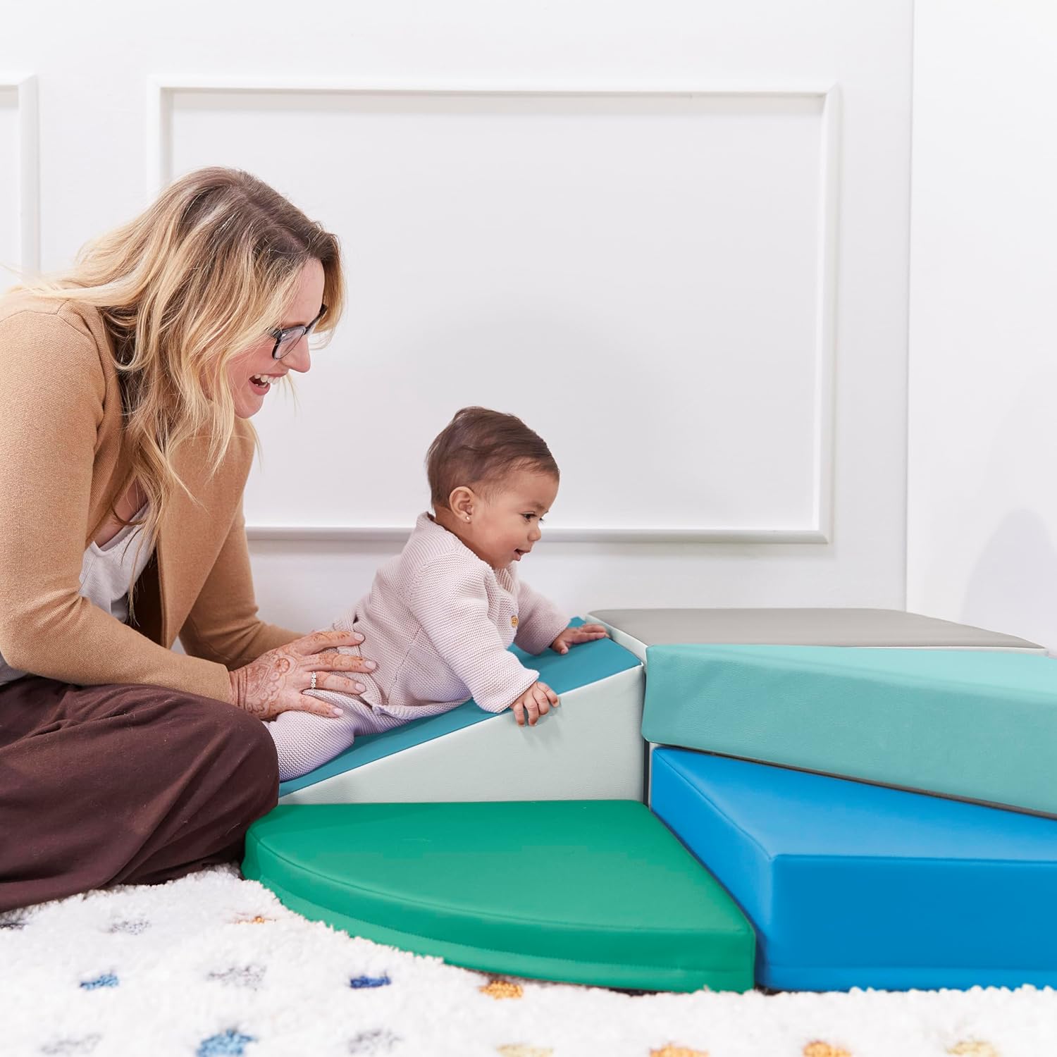 Give your little ones an exciting twist on play with the SoftZone Junior Tiny Twisting Corner Climber. The beginner climber includes tiered steps, a ramp, a pedestal, and a pad with endless opportunities for climbing, crawling, and social interaction. Scaled down in size, this mini foam playset is great for daycares, apartment homes, and smaller playrooms. With adult supervision, this playset is intended for use in a corner of a room for safe play that promotes and strengthens early muscle movement, enhances physical coordination, and balance, and helps overall body control. The climber keeps curious babies active and engaged while encouraging little hands and feet to explore the gentle foam climbing structure. The small foam shapes can be used independently or as a part of a fun obstacle course. As young children explore, they gain self-confidence while improving hand-eye coordination, agility, and core strength. Soft blocks are lightweight allowing parents and teachers to move and stack for space-saving storage. The foam core of each piece is covered with water-resistant polyurethane vegan leather with a durable woven backing and features a non-slip base for added stability. Fully stitched seams and soft edges make this play set safe for children.