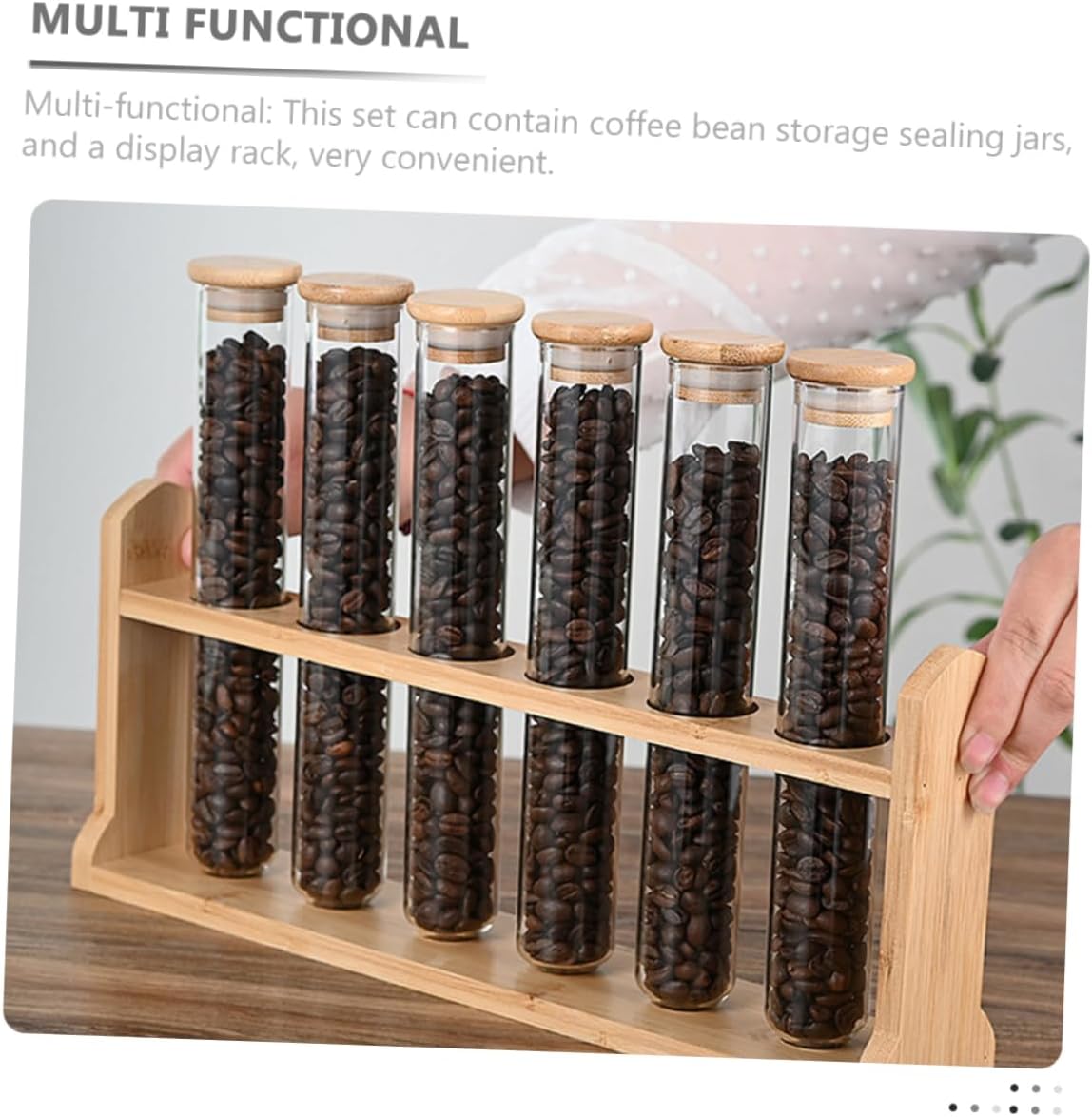 Package List 6 x glass tubes 1 x wooden stand Features -Material:Wooden, glass Coffee Storage Tubes -Size:22.50X4.00X4.00cm/8.84X1.57X1.57in(tube) Glass Storage Jars - Adds touch of sophistication: the sleek and modern design of the display tubes set adds touch of sophistication to any room Coffee Container Wooden Display Stand. -Size:35.50X15.00X7.00cm/13.95X5.89X2.75in(wooden stand) Glass Tube With Wood Stand - Enhances coffee experience: the set allows you to store and display your favorite coffee beans, enhancing your coffee experience Glass Coffee Bean Storage Tubes. -Color:Transparent Glass Sealed Jar - Great for coffee shops: the set is for coffee shops looking to display their coffee beans in an elegant and practical way Glass Coffee Holder. - for coffee enthusiasts: the set is a must-have for coffee enthusiasts who want to store and display their coffee beans in style Coffee Beans Airtight Holder. - Easy to assemble: the set is easy to assemble and disassemble, making it convenient for storage and transportation, convenient Coffee Bean Display Jars.Goods DescriptionCoffee Bean Display Stand This item is a kind of storage ornament, made of glass and wood materials, safe and convenient to use. with Wood Stand Are you looking for a storage container for your home table to store coffee beans? If you are, then come to see these storage containers that we have already prepared for you