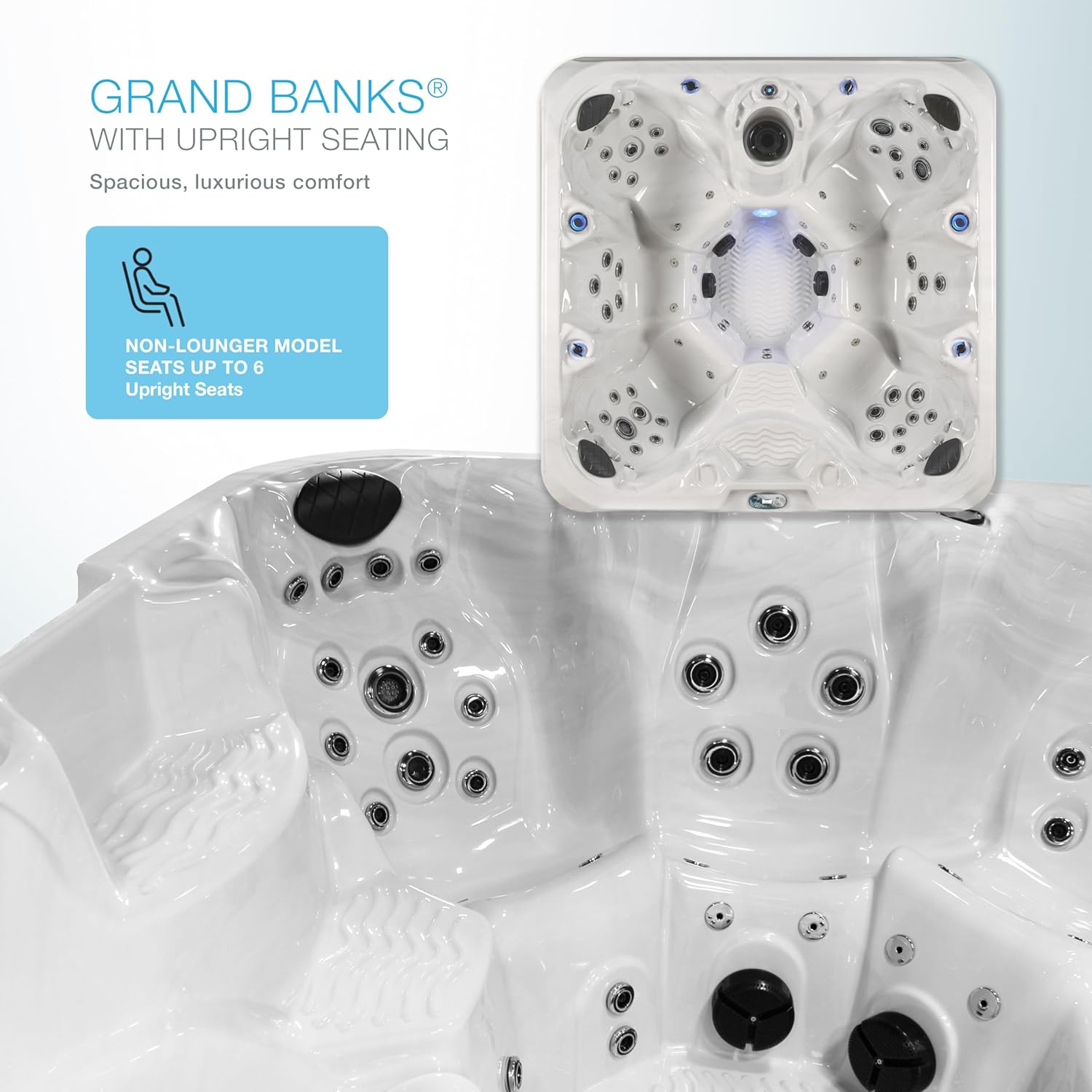 The Grand Banks® is a well-appointed spa designed to improve the way you feel and live every day. Be transformed by our 120 streaming jets of soothing water, through 81 fully adjustable stainless steel jets while they target the areas where you want it the most. The Grand Banks spas have seating for up to 6 people. Our careful design delivers the optimal and most effective water pressure through every jet, leaving you refreshed. The energy-efficient 5 BHP 2-speed Pump, 5 BHP high-speed Pump and 1 HP Blower have been specifically engineered to deliver Powerful, yet comfortable, deep tissue massage. A 4kW stainless steel heater consistently maintains your ideal water temperature. You control your spa experience, your way, with our user-friendly backlit digital topside control. Beautiful LEDs enhance the waterfall, beverage holders, and control valves. Additional lighting effects are in the main light and exterior cabinet lighting for improved ambiance and safety. Our cabinets are UV-resistant, and maintenance-free. A factory-installed ozonator makes maintaining your spa easy. Ozone delivers natural water purification, keeping your spa water cleaner and reducing the need for harsh chemicals. The tapered insulated and locking spa cover also helps keep spa water free of debris and increases safety and efficiency. 2-tier spa steps are included, too! Construction: Made in the USA of quality US and imported parts using expert craftsmanship.