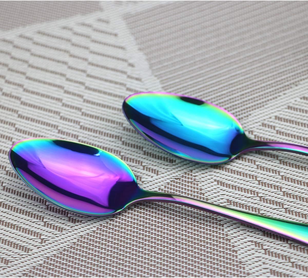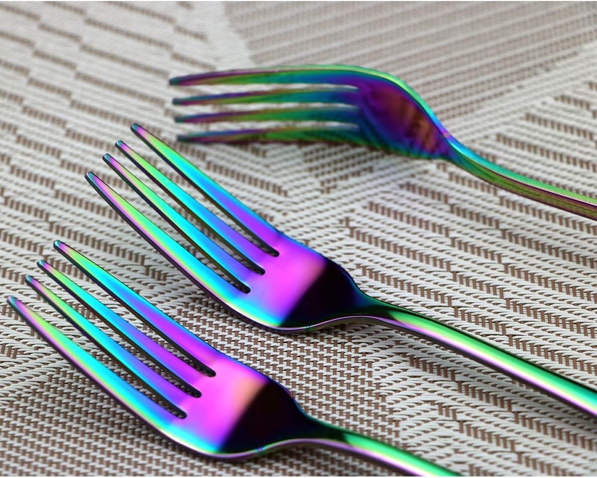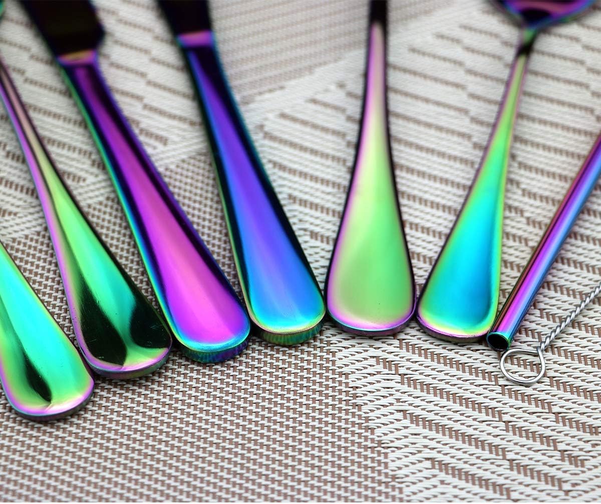 Gugrida Focus on creating great design for kitchen gadgets;We do the best to improve the kitchen life through constantly introducing good design and highly quality inspection.our products speaks the fashion and utility language,meets for each customer's requirement and expectation.Rainbow Color 18/10 Stainless Steel Flatware Set,please choose the best suitable series for u. This flatware with simple design is practical and fit any style tableware, It has a proper thickness and weight to hold comfortably. It is a value multi-purpose set for daily use or when you need extra flatware set when having parties/gatherings/campings Also a great gift for your friend and families’ new apartment. SIZE Dinner Knife 25cm / 9.84 inch Dinner Fork 21.5cm / 8.45 inch Dessert Fork 20cm / 7.87 inch Dessert Spoon 20cm / 7.87 inch Dinner Spoon 22cm / 8.66 inch Tea spoon Spoon 14.5cm / 5.7 inch USING INSTRUCTION1. Please wash the flatware set with warm soapy water before first using to wash off any residue left from the manufacturing process2. Please clean and dry the flatware set after using for your healthy daily use, Stored in dry place for its durabilityThank you for choosing our products!. Wish you enjoy a HEALTHY & GREEN LIFE with our products.