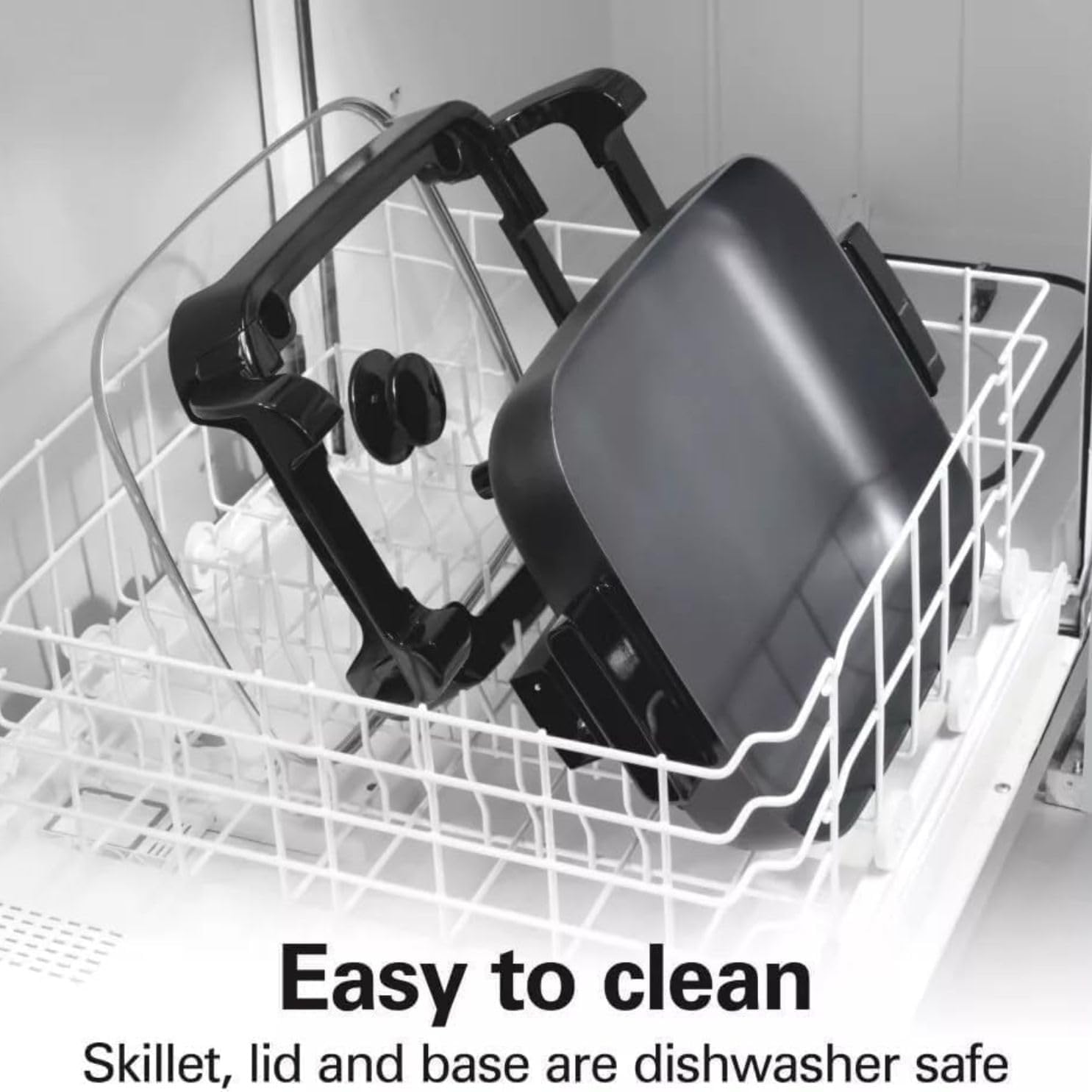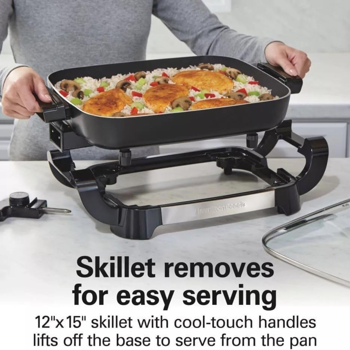 The Hamilton-Beach 20.5" Durathons Ceramic Electric Skillet is a must-have for every kitchen. Featuring a scratch-resistant Durathons ceramic coating, this nonstick surface lasts four times longer than standard coatings. Its 20.5-inch large cooking area ensures ample space for preparing family meals, making it ideal for frying, sautéing, and simmering. Equipped with an adjustable temperature control that reaches up to 400°F, you can cook a variety of dishes with precision. The reversible nonstick skillet delivers consistent heat distribution, ensuring even cooking. With dishwasher-safe removable parts, cleanup is effortless—just remove the skillet and lid and place them in the dishwasher. The cool-touch handles provide a comfortable grip, ensuring safe handling while cooking. Designed for convenience, this electric skillet is an essential kitchen appliance that simplifies meal preparation. Whether you’re making breakfast, lunch, or dinner, the Hamilton-Beach Electric Skillet delivers reliable performance every time.