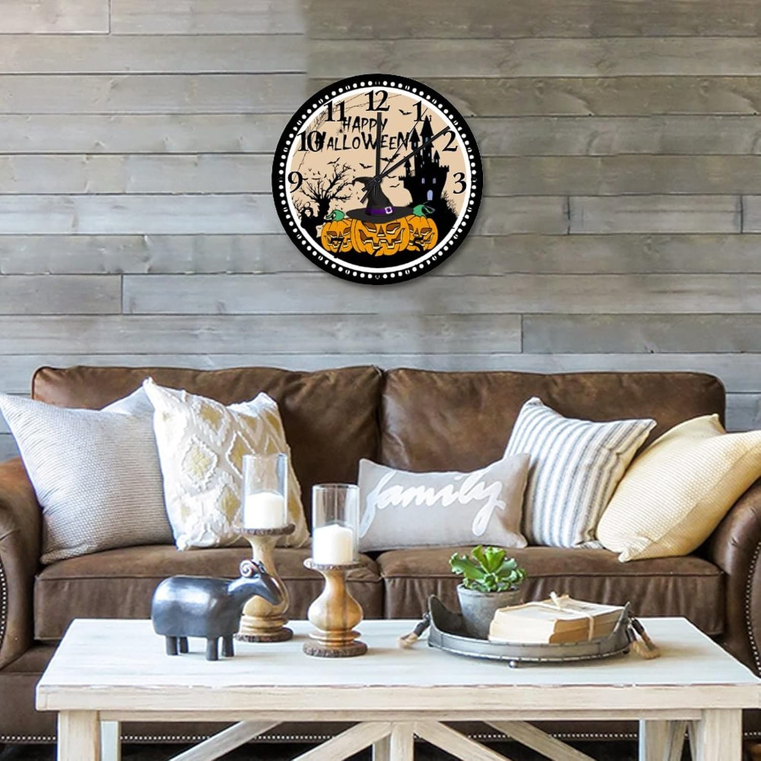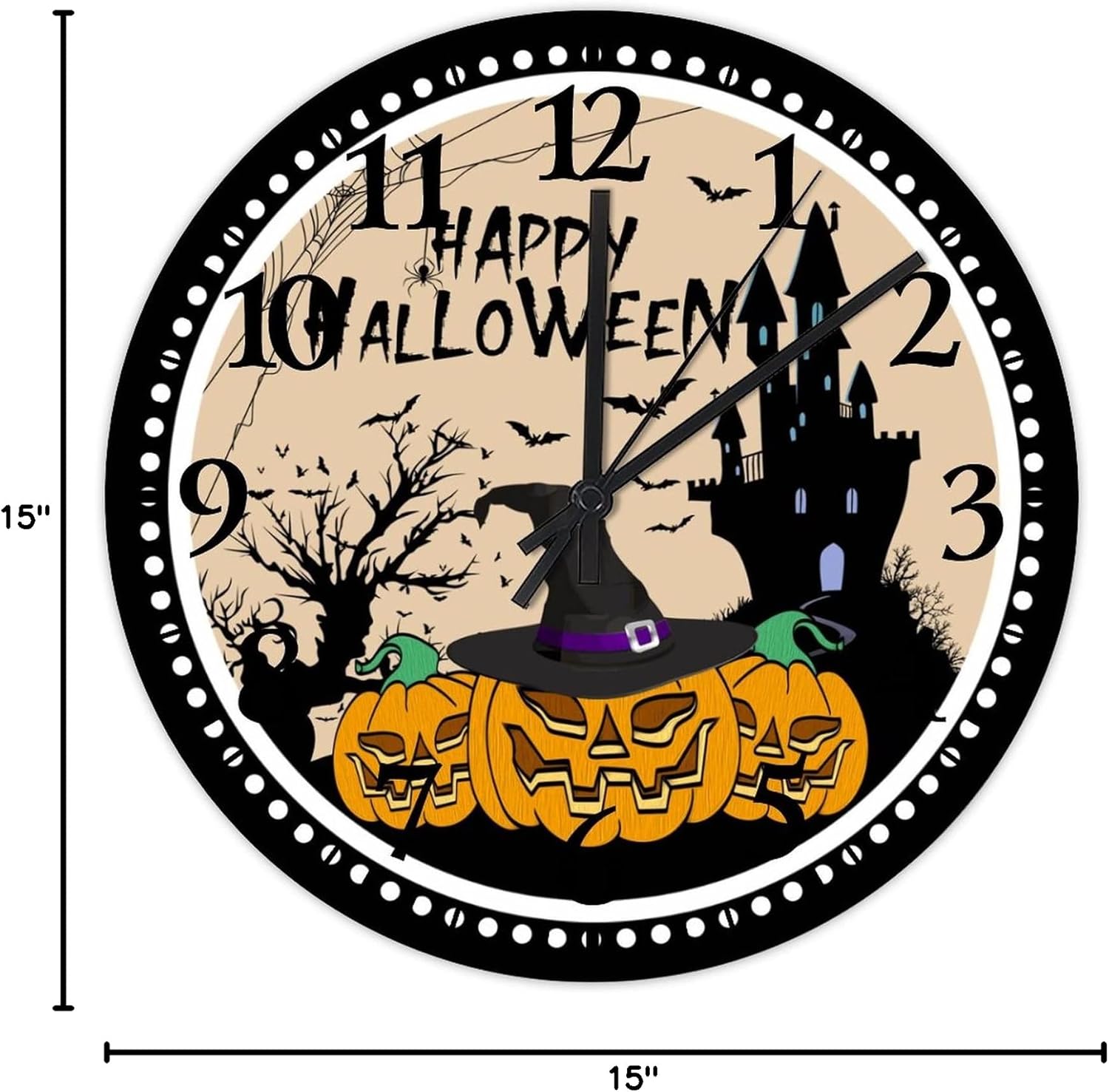 Happy Halloween Pumpkin Hunted House Wooden Wall Clock halloween Jack-o'-Lantern Pumkin Rustic Wooden Art Hanging Clock Quality Quartz Non Ticking Arabic Numbers Clock Home/Office/Kitchen Decor 15 Inch??Details:Product Size: 10/12/15 inches, (25/30/38 cm)Shape:RoundMaterial: Wood??Functional Home DécorThis Witch Hat with Evil Pumpkin clock aren't just for timekeeping. They function as beautiful wall decor pieces, beyond telling time, and bring both style and purpose to any room.A charming home decoration, very suitable as a housewarming gift, making the home more warm. Suitable for any room, you can put it in any room such as home, living room, master bedroom, kitchen, bathroom, home office, etc. Elegant, durable and stylish.??Clock Hands Troubleshooting Guide:Check that the battery is a new battery and not a used battery.Make sure the hour and minute hands are not crossing or touching each other. If they are, adjust the hands by slightly bending them.See if the center pin that holds the hands together is firmly pushed in or screwed on, depending on the style.If hands are still not moving after the above, please reference the hands replacement instructions included with all of our open face clocks.