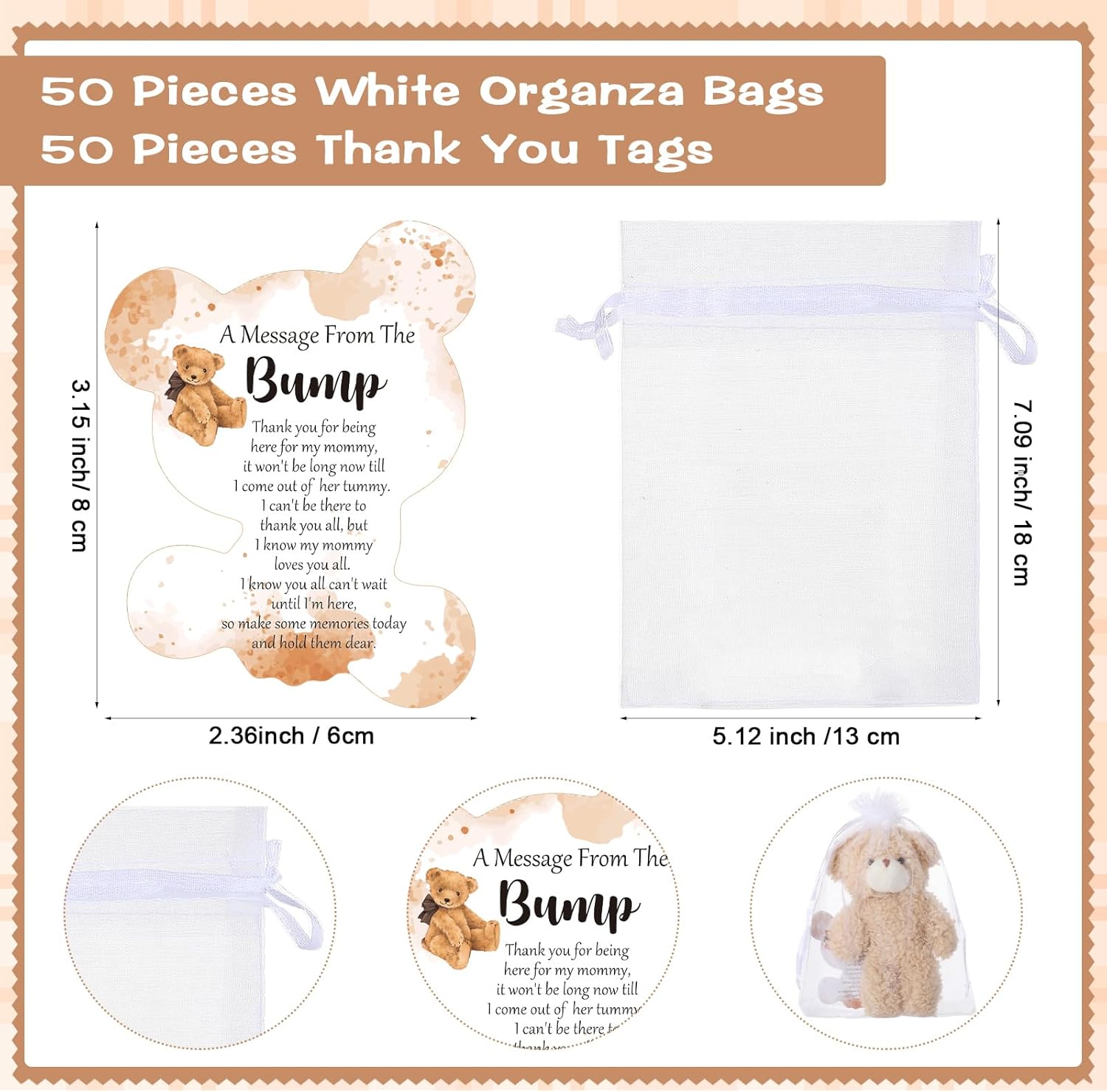 Features: If you struggle with finding a charming gift, our bear party favor is a nice option. With a thank you card and a gift bag included, your guests will have a full package, creating an exciting unboxing experience and leaving a lasting memory. The included plush bears aren't just for show and tell, they're also functional, each small bear for baby shower comes with a small loop, turning it into a keychain. Guests can easily decorate their bags, backpacks or wallets with this delightful bear keychain. It's not just a keepsake, it's a practical creative memento of your special occasion. Specifications: Material: Bear: plush, stuffed PP cotton Card: coated paper Bag: organza Color: Bear: light brown Card: white, light brown Bag: white Size: Bear: about 4.53 inches/ 11.5 cm in height Card: about 3.15 x 2.36 inches/ 8 x 6 cm Bag: about 5.12 x 7.09 inches/ 13 x 18 cm Package includes: 50 x Small bears 50 x Thank you cards 50 x Gift bags Notes: Manual measurement, please allow slight errors on size. The color may exist a slight difference due to different screen displays.