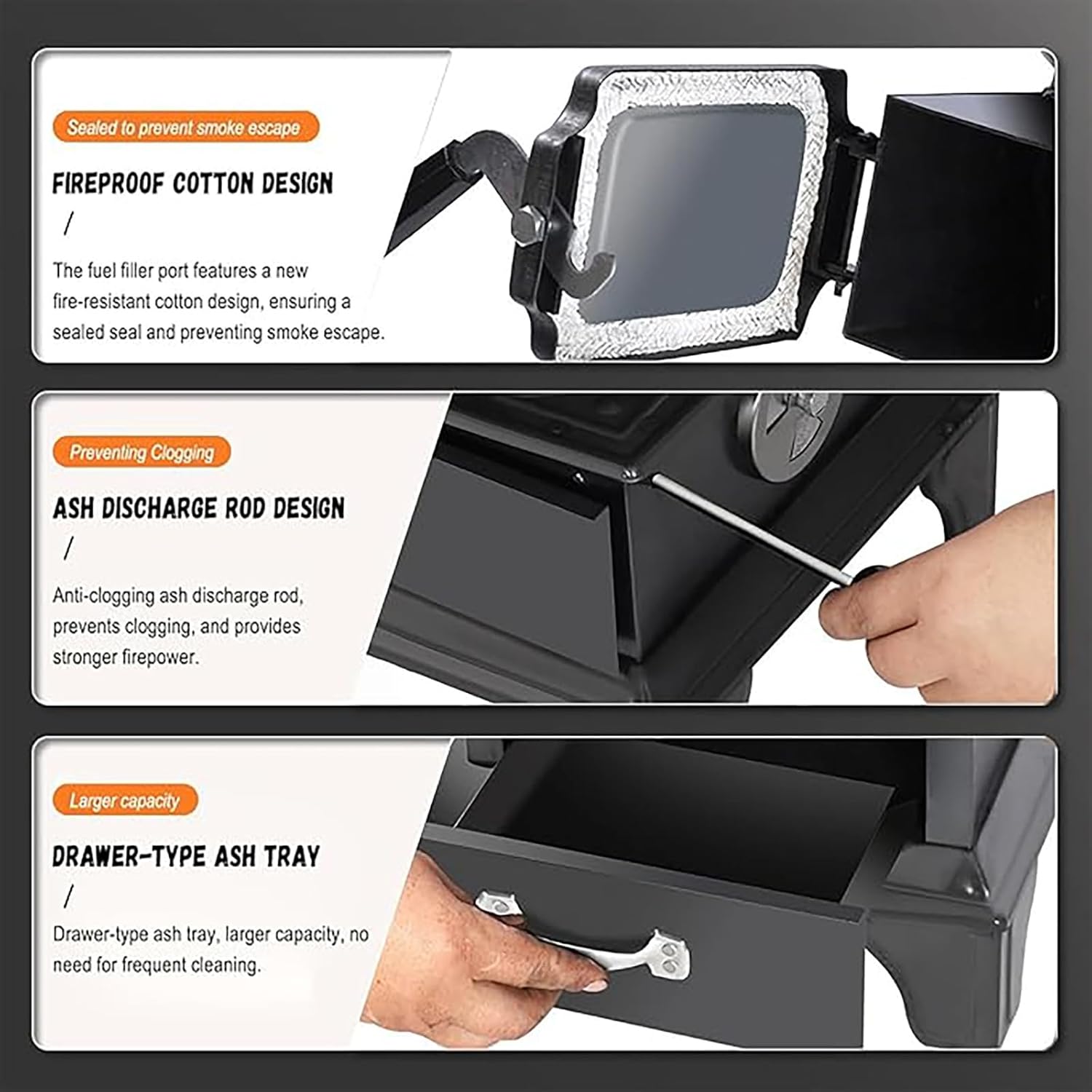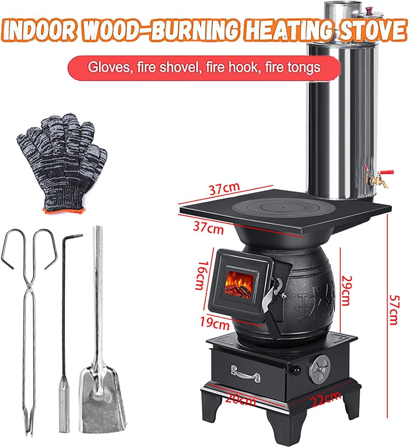 Stop worrying about staying warm! This amazing, compact wood-burning stove is here! It features efficient combustion, rapid heating, and even heat distribution, bringing instant warmth to your home!Features:1. Made of strong cast iron, it burns fuel efficiently. You can get more heat from each piece of firewood, saving on fuel costs.2. It can spread heat evenly in 360°, ensuring every corner of small to medium-sized areas stays warm without cold spots.3. This compact wood stove is great for cabins, rooms, and tents. Its small size won't take up much room, perfect for limited-space heating.4. With its efficient design, it can quickly increase the room temperature, providing instant warmth when you're cold.Specifications:Product Name: Indoor Wood-Burning Heating StoveMaterial: IronStove Measurements: 37x37x57cm/14.56x14.56x22.44inProduct Type: Indoor Wood-Burning StovePackage Size: 40x40x65cm/15.74x15.74x25.59inPackage Weight: 22.5kg/49.6IbsPackage Included:A: Cast Iron Stove + Accessory KitB: Cast Iron Stove + 2-Meter Chimney with Two Bends + Accessory KitC: Cast Iron Stove + 2-Meter Chimney with Two Bends + Safety Mesh + Accessory KitD: Cast Iron Stove + Stainless Steel Water TankShipping Note: To ensure secure delivery, your order may arrive in 2–3 separate packages.Safety Notice: During operation, the stove body and chimney pipe become extremely hot. Always keep children and pets away from this indoor wood-burning stove to prevent burns or accidents.Note:1. Color of this item may vary slightly from the pictures due to differences in light and screen configurations.2. Please allow slight size differences due to different manual measurements.3. If you have questions or suggestions about our products, email us for feedback. We'll reply within 24 hours and offer friendly after-sales service.