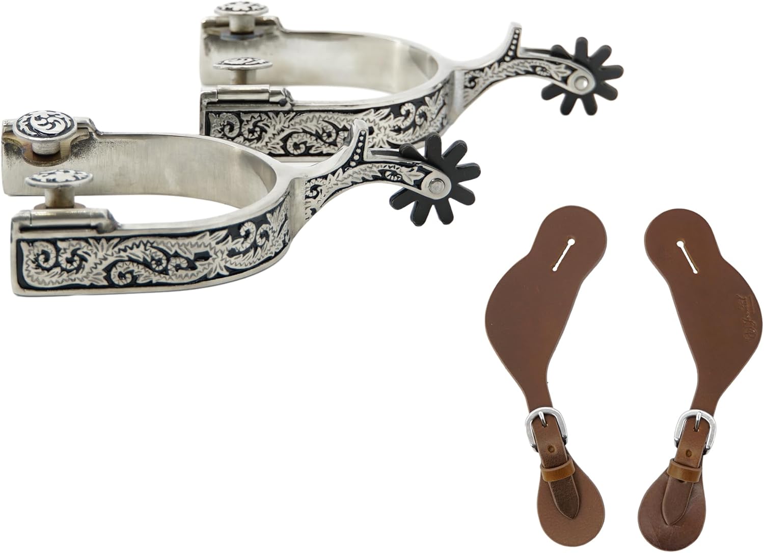 Add an authentic Western touch to your riding gear with these classic antique-style spurs. Featuring exquisite German silver trims with detailed engraving work, these spurs combine both style and functionality. The set includes matching spur straps for secure attachment to your boots. The traditional Western design showcases intricate craftsmanship that catches the eye while maintaining practical usability for riders. Perfect for both show events and regular riding, these spurs deliver the distinctive jingling sound that's synonymous with Western riding tradition. The durable construction ensures these spurs will be a lasting addition to your riding equipment. Whether you're an experienced rider or looking to enhance your Western riding outfit, these spurs offer both aesthetic appeal and reliable performance. The adjustable straps ensure a comfortable, secure fit for various boot sizes.