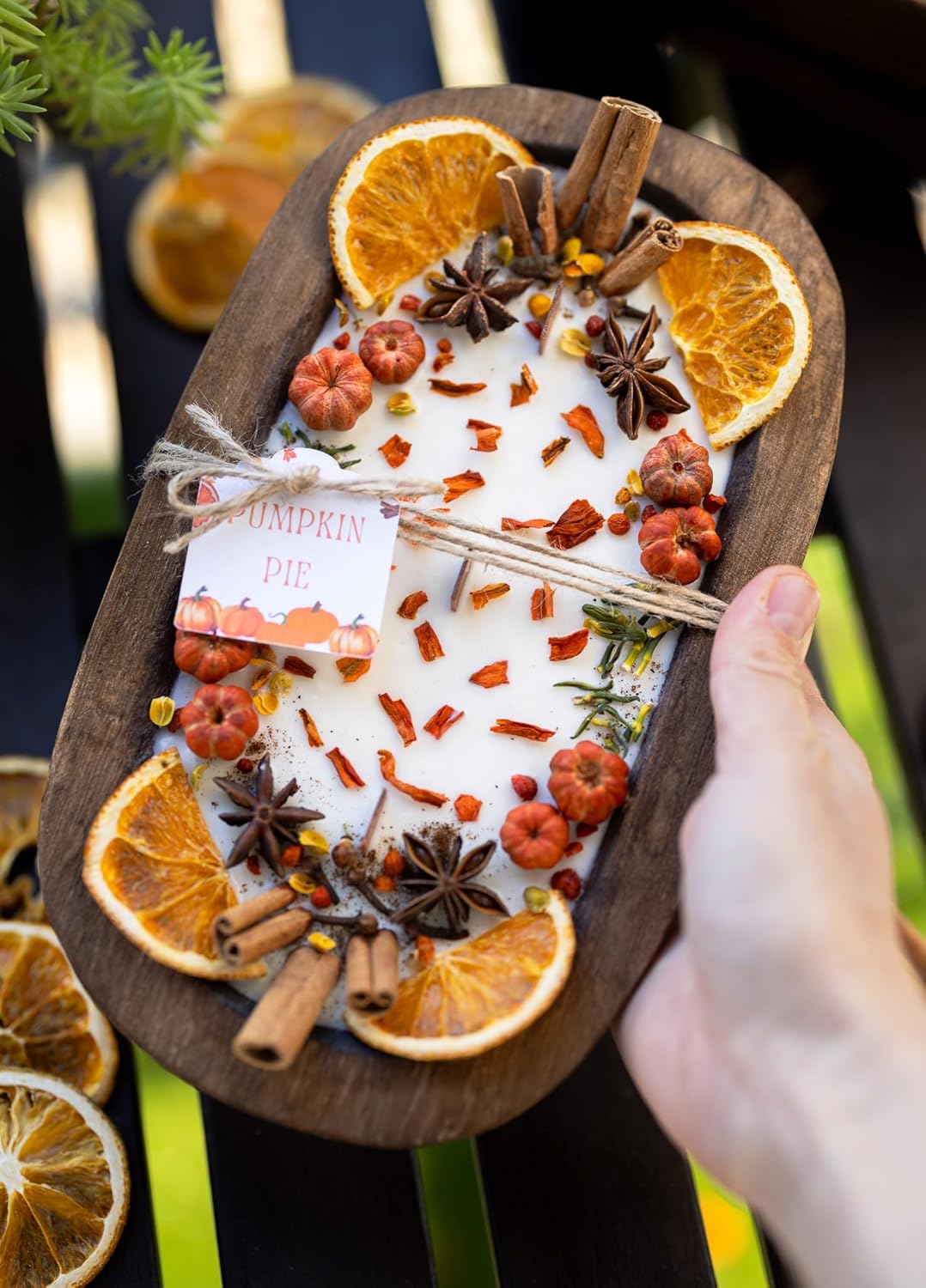 Large Wooden Fall Candle / Autumn Season / Pumpkin Orange Decoration / Pumpkin Pie / Fall Home Decor/Pumpkin Wood Bowl Candle This Fall candle fills your home with a feeling of coziness, and holds magical properties attracting luck, blessings, happiness, peace, and protection! Its a perfect gift for fall , winter , halloween. Size : Long- about 9-10in in Bowl H-2in Wide:5-6 in Weight of the wax : about 300-360g may vary Please note: as the dough bowls are hand - carved and sourced from a local seller, the shape, color and sizes may vary. Please never leave a burning candle unattended. Please note if you decide to burn this candle , since everything is dry and real and this is wood , if you don't remove the decor on top or you don't move it around they can get of fire. So Please make sure you use your own safety and cation on your own risk. Please note this listing is for one Candle only. Each candle is hand poured with vegan natural non GMO pet friendly soy wax. Your bowl is also reusable , after your wax is burned just clean it and you can use it as decoration or storage etc. If your shopping as gift pls note there is Cards available You can just write your text and your name and we can made it for you , they come in white , light pink , light brown color with some black text , we can also customized by your wishes. Each candle is poured in small batches. Every single candle is unique and colors may vary.