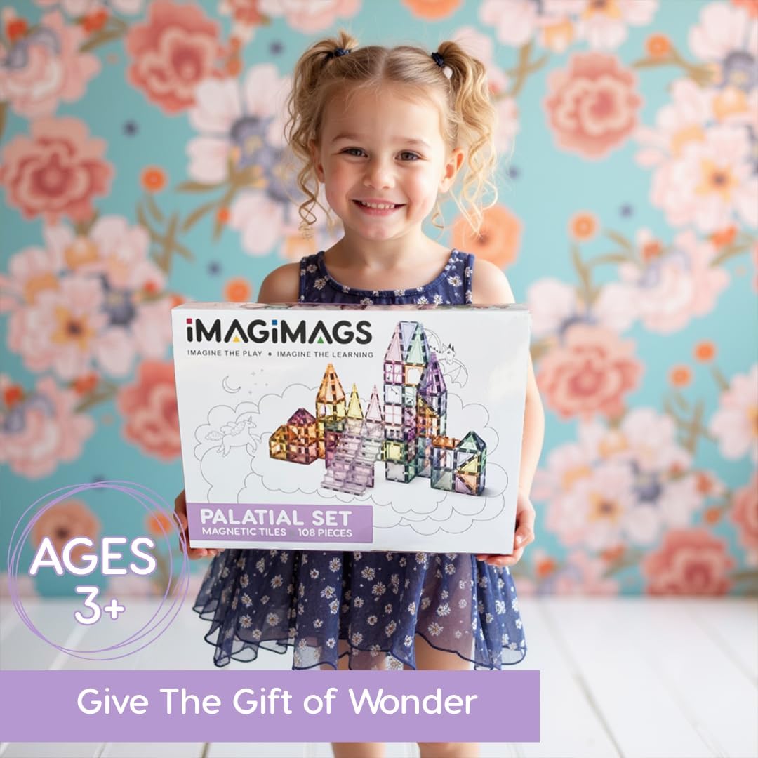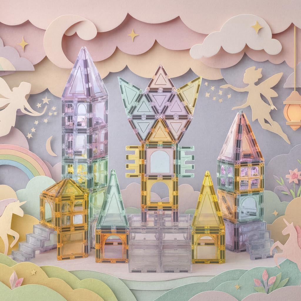 | Included Components | 108 Pastel Magnetic Tiles: 36 x Squares,12 x Arches, 12 x Equilateral Triangles, 12 x Isosceles Triangles, 12 x Tall Triangles, 12 x Windows, 6 x E Shapes, 4 x Staircases, 2 x Large Bases (Squares), What's in the box: |