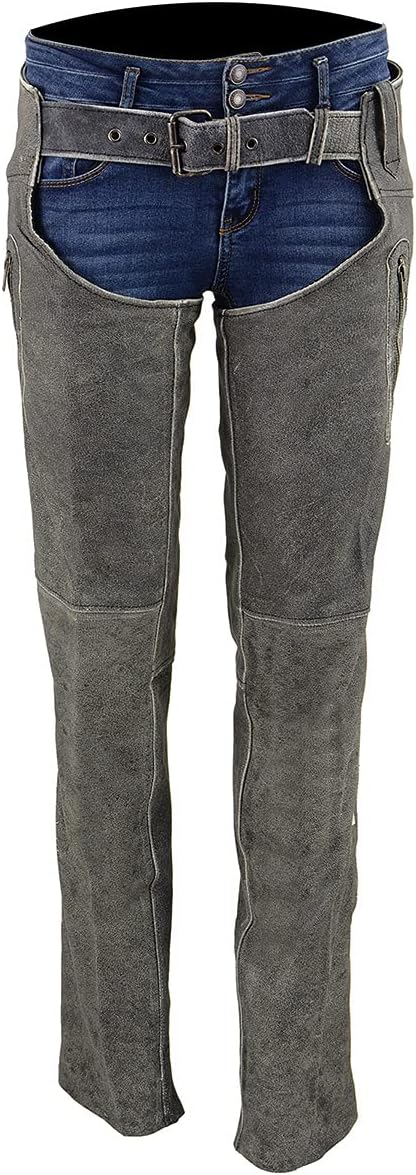 Milwaukee Leather MLL6505 Women's Grey Vintage Slate Chaps with Racing Stripes Features Made of Premium Goatskin Crackle Leather Vintage Racing Stripes Two Zippered Thigh Pockets Built in Adjustable Front Belt Adjustable Back Lace for an Optimal Fit Side Zipper Entry with Lower Snap Button Closure Inside Zipper Buffer Prevents Liner from Snagging in Zipper The Inside is Lined to the Knee Area Unhemmed – Cut to Your Desired Length / Height Genuine YKK Zippers -Known for Longevity and Durability Milwaukee Leather - Once You Have It, You Love It!