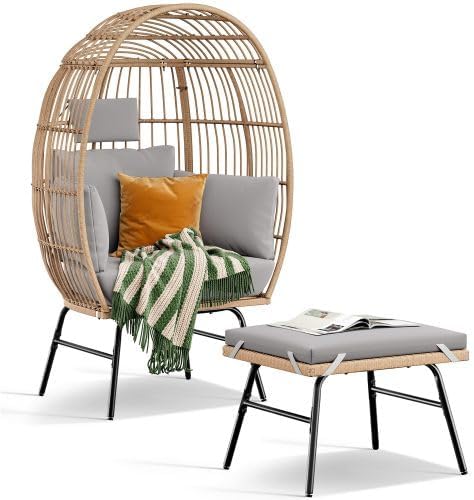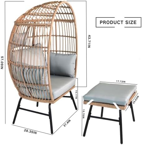 Product Features 【HIGH CAPACITY OF 400 LBS】Indulge in ultimate relaxation with the robust egg chair for patio; This oversized egg chair outdoor impressively accommodates up to 400 pounds, making it an ideal retreat for individuals of all sizes 【Lumbar Support & Durable 】Elevate your comfort with this ergonomic cushion designed to relieve lower back discomfort. Ottoman with all-weather PE wicker and powder coated steel frame are designed for durable & long-lasting use. 【THICK AND DURABLE CUSHION】High quality cushion fabric on this outdoor egg chair does not fade when exposed to water or weather conditions; The 2 person egg chair also has a generous 3.9 inch thickness seating cushion and a 1.97 inch thickness pedal chair 【Hand-woven PE wicker】This egg chaise lounge is all wrapped in hand-woven PE wicker, with excellent fading resistance and strong elasticity to avoid deformation and cracking