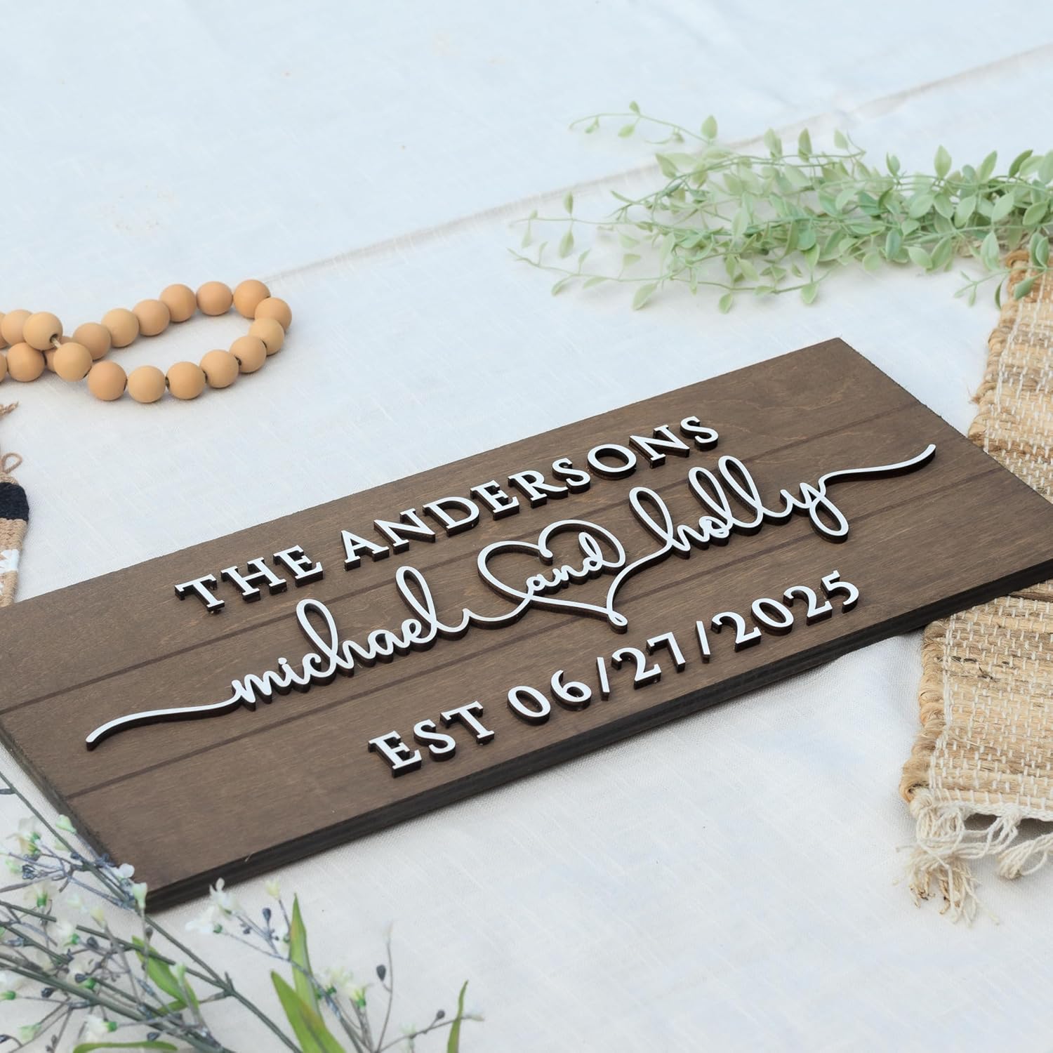 This custom 3D rustic sign makes a beautiful personalized addition to your home. It also makes for a unique wedding, anniversary, and a bridal shower gift. Raised lettering creates a rather unique 3D effect that adds depth and character to the piece. The letters are laser cut from 1/4" wood then mounted on top. Choose from our stain colors to accentuate the natural wood grain to your liking to match your aesthetic. Each board is hand selected for quality assurances, but the grain and stain of each sign will vary slightly since each piece is unique.SIZES: 8" x 20" 9.5" x 24"STAIN OPTIONS Choose your color from the drop-down menu. An image above shows the stain colors.
