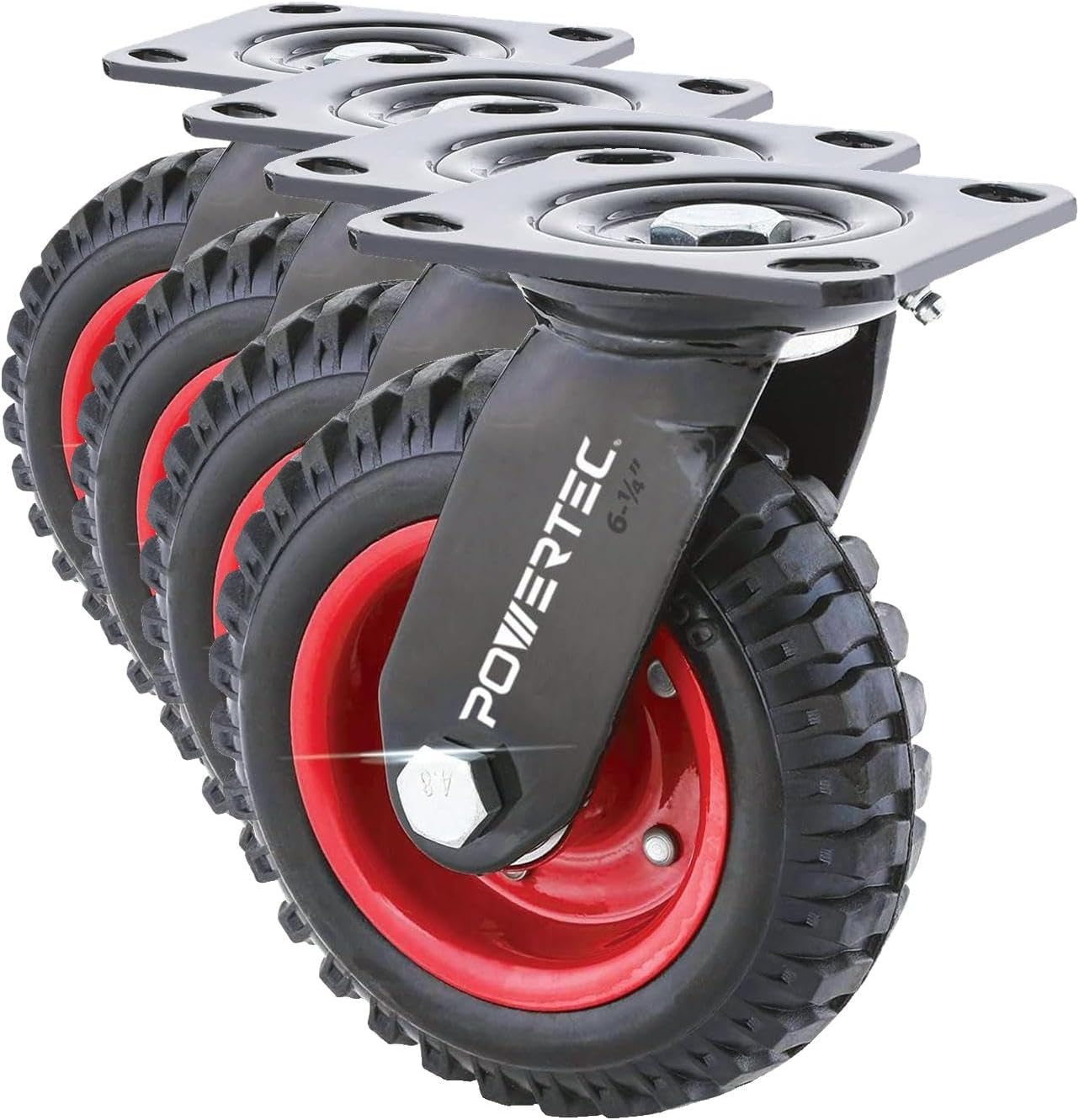 Introducing the 6" Dual Locking Swivel Caster Wheel (4pc) Set by POWERTEC.An impressive combination of precision and heavy duty craftsmanship, these well built steel swivel casters are conveniently paired with polyurethane (PU) rubber wheels. Each wheel was designed with a dual locking lever that adds exceptional stability for material handling and braking versatility for assortment of indoor and outdoor mobilized applications.The swivel mechanism ensures a 360 rotation, providing optimal maneuverability to make smooth transitions or to turn tight corners and take on any obstacle along the way. Each caster wheel flaunts an impressive 1390 lb loading capacity - perfect for an assortment of heavy lifting jobs.The non-marring wheels protect your floor and offer a soft cushion ride. The plate mount comes with 4 pre-drilled holes, offering a simplistic approach to mounting. Additionally, the high precision ball bearings offer exceptional noise reduction, decreased rolling resistance and consistent hauling.Commonly Used ApplicationsDolliesMoving FurnitureIndustrial Equipment Cartsand more!Set Includes a 4 piece set of 6-Inch Swivel Double Lock Polyurethane Plate CastersPOWERTEC is a leading manufacturer of high quality wood work accessories, sanding discs and an assortment of OEM replacement parts. We are committed to exceeding expectations, while bringing the latest innovations, technology, and product development to the industry.