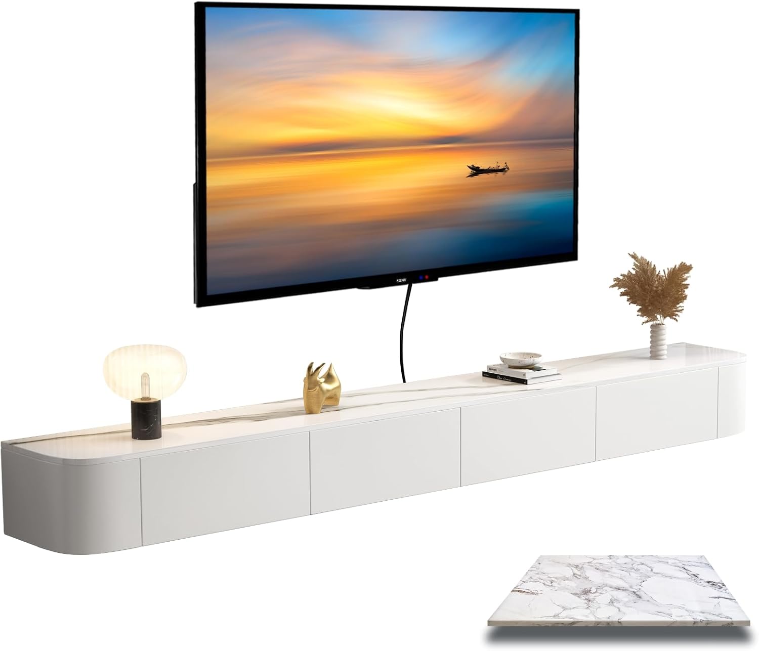 Tired of bulky TV stands stealing your floor space? Meet the MWIDCIEW Floating TV Stand – where modern minimalism meets hassle-free functionality.Why It’s a Game-Changer:Say goodbye to weekend assembly marathons. Unlike flat-pack nightmares, our TV stand arrives fully assembled and ready to mount. Just unbox, secure it to your wall with the included heavy-duty steel brackets, and boom – your living room is instantly upgraded. No hiring installers, no deciphering confusing manuals. Made to Fit Your Life:Custom Sizes for Any Setup: From cozy studios to sprawling home theaters, choose from 10 lengths (47"-118") to perfectly frame your 32"-85" TV.Cord Apocalypse? Not Here: Built-in channels tangle-proof your wires, while hidden compartments swallow routers, cables, and that PS5 you swear you’ll organize “tomorrow”.Looks Expensive (But Isn’t): The modern design and clean lines scream “designer magazine,” minus the pretentious price tag.Built to Outlast Trends:We skipped the particleboard nonsense. Inside, a solid wood core resists warping and cracks – even in humid basements or sun-drenched lofts. Plus, with 0% formaldehyde emissions, it’s safe enough for nurseries and allergy-prone homes.Try It Risk-Free:Love it, or return it within 30 days – no questions. Got mounting jitters? Our 24/7 U.S.-based experts will guide you via chat or call. And if life happens? Your 2-year free parts warranty has your back.