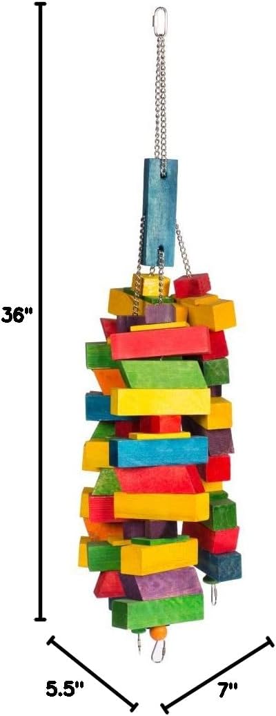 Playfuls™ Tentacles 60946 from Prevue Pet Products is a multi-sensory activity toy, designed to entertain and engage birds on all levels. Physical and Mental toys provide exercise for the body and mind. Keep your bird engaged and stimulated with elements that make them move, solve, balance, manipulate and chew. Engagement in these areas contributes to a bird's overall physical and mental well-being. Made with an assortment of shapes this bird toy encourages foot and beak exercise. This is a durable toy for large to extra-large birds, designed with components that can be moved and played with. Spread out the “tentacles” and this toy gives your bird multiple places to perch and play. This pet-safe toy is made using a bird-safe chain, multiple quick-links and wood blocks. When closed, toy measures approximately 33” high by 7 1/2” long and 1 1/2” wide. Toy can vary slightly in shape and size. As always supervise your pet at play. Inspect toy regularly and replace when used or worn.