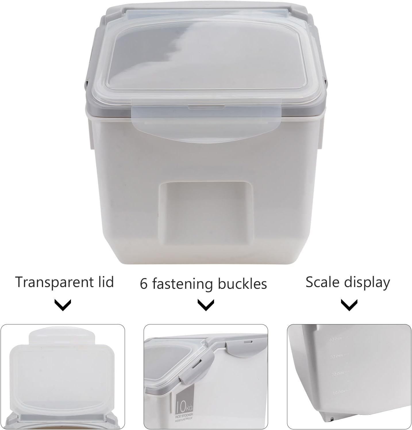 Package Include 1 x Rice Storage Bucket Characteristics - Color: Grey. - Material: PP and silicone. - Size: x 19.5 x 27 cm. -Product Info:Sealed rice bucket - With visible window design, you can see the inner clearly , don need to open the box Rice Storage Bucket. - This is a new household rice bucket made of PP material, suitable for mobile storage in the kitchen. - Scale display on the side, you can know the amount easily and quickly. Comes with a measuring cup, the bottom has wheels, and flip-type opening, very easy and convenient. - It can be safely used for dry food such as brown rice, nuts, beans, cereals, snacks, oatmeal and so on. - With 6 fasten buckle design, fasten tightly, the sealing effect is pretty great.Goods DescriptionRice Storage Bucket Sealed buckle design, waterproof, , safe to use.Flour Organizer It is a rice storage bucket, made of food-grade PP plastic, safe and environmentally friendly.Rice Bucket Multifunctional design, a perfect solution for rice storage, which can keep rice dry and.Rice Cylinder Great for storing rice, or whatever you need every day. Flip-type opening, more convenient