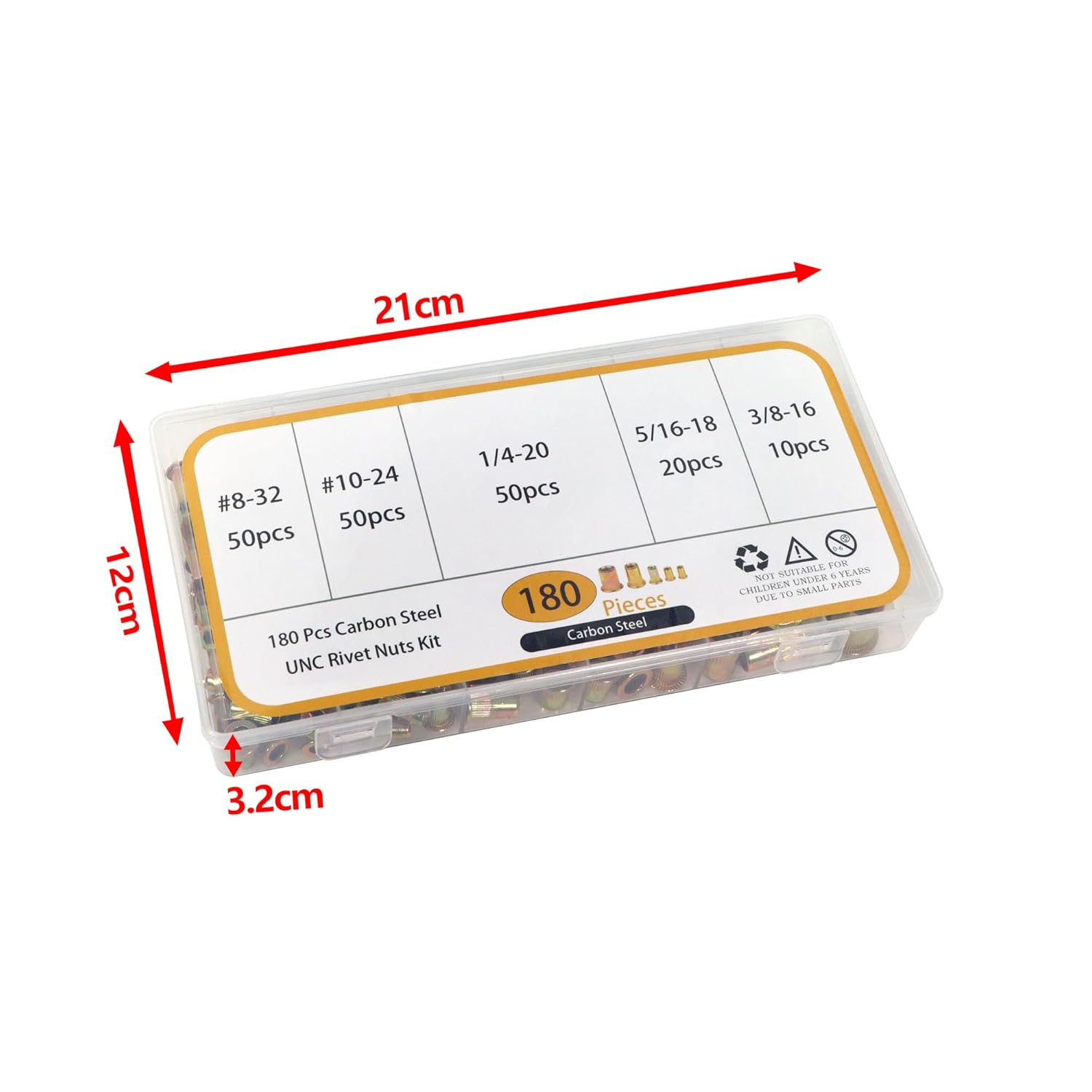 Features: Rivet nuts are made of carbon steel, strong rust and corrosion resistant for a long time use; Zinc plated surface help prevent surface damage and fade, anti-oxidation, high strength, not easy to deform.Rivet nuts are knurled, with flat and deep threads, easy to fix and good anti-slip effect.The transparent thicken storage box is durable enough to accommodate all items. And with dividers to clearly separate each size, with size/ type chart. you can get the exact size easily.Rivet nuts are widely used in the assembly of electromechanical and light industrial products such as automobiles, lifts, switches, instruments, furniture, decorations and so on.Specifications: Material: carbon steelSurface treatment: galvanizedSize: #8-32, #10-24, 1/4"-20, 5/16"-18, 3/8"-16Package Contents: 50pcs #8-32 Rivet Nuts50pcs #10-24 Rivet Nuts50pcs 1/4"-20 Rivet Nuts20pcs 5/16"-18 Rivet Nuts10pcs 3/8"-16 Rivet Nuts