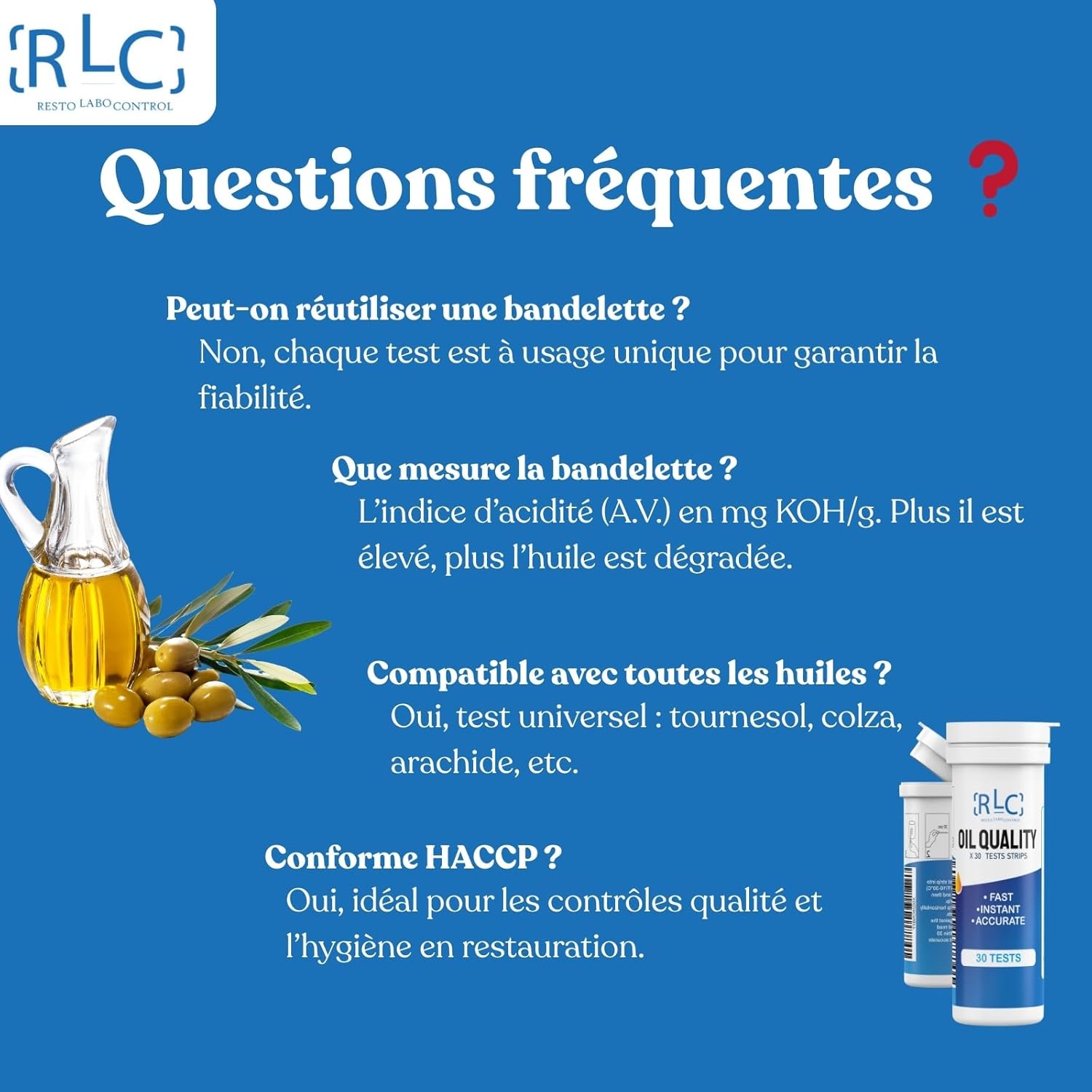Optimize your frying and secure your hygiene controls. In pro cooking, changing the oil too early is expensive, changing it too late risks a fine. Our FFA (Free Fatty Acids) strips offer a quick diagnosis for accurate and economical management. Why choose our tests? HACCP compliance: Integrate these tests into your self-control protocol. They prove to track the quality of your cooking fats. Technical accuracy: 0 to 5.0 mg KOH/g range for a fine reading of the acid number and true monitoring of degradation. Savings: Identify the critical moment (3.0 - 5.0) to maximize oil life without health risk. Instructions for use (strict protocol): Sample: Dip the strip for 2 seconds in a cold oil (10°C to 30°C). Wait: Hold it horizontally for 120 seconds (2 minutes). Do not shake. Comparison: Compare with the colour chart of the bottle. Read within 30 seconds. Interpretation: Blue / Turquoise (0 - 0.5): GOOD - High quality oil. Water green (1.5 - 2.5): CAUTION - Used oil, to be monitored. Olive / Yellow (3.0 - 5.0): BAD - Degraded oil, to be replaced. Contents: Bottle of [30 or 100] strips with airtight cap and moisture absorber. Note: Decision support tool for daily self-control of restaurateurs. Complements regulatory analysis.
