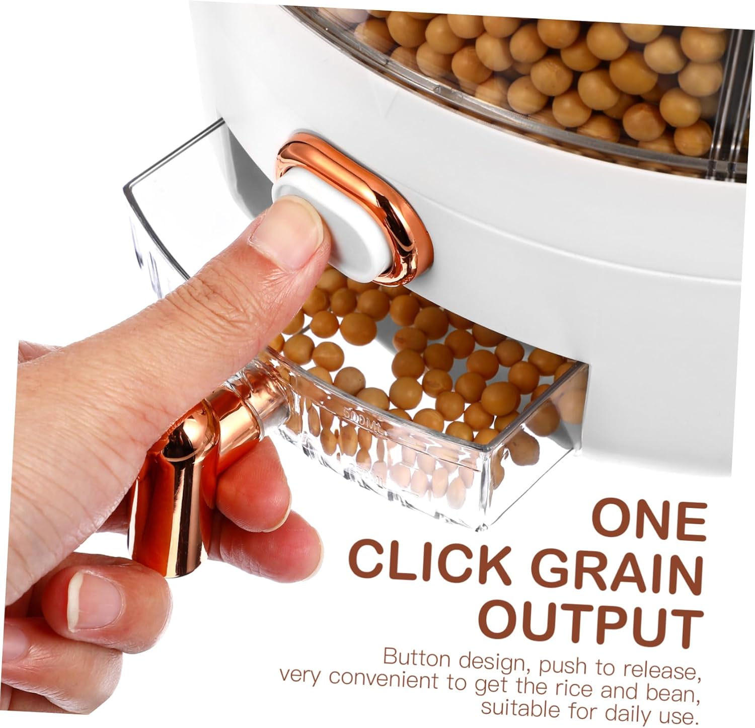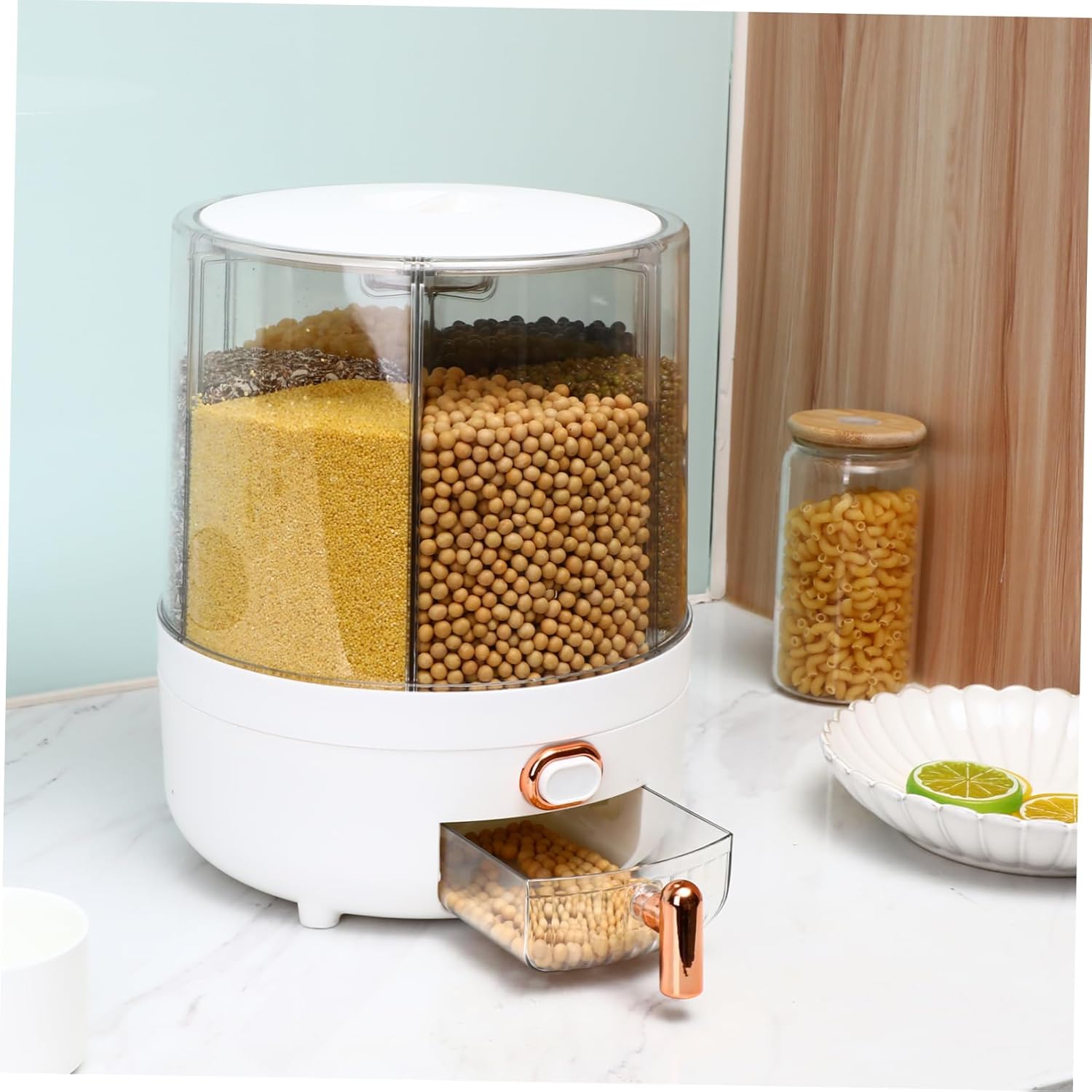 Package List 1 x Rice Dispenser Features -Size:24.00X24.00X29.00cm/9.43X9.43X11.40in rotating rice storage container -Color:Multi rotating food dispenser -Material:PP rotating grains dispenser -Capacity: Hold Up to 10KG Rice countertop grain dispenser Rice container uses button design, you can push to release, which is very convenient to get the rice and bean dry grain dispenser. With 360-degree rotating design, you can pick the cereals at will and freely choose what you want household cereal dispenser. This kitchen rice dispenser is designed with six compartments for sorting and sorting without mixing grains rice and bean dispenser. The use of silicone strip makes this dispenser a good sealing performance, keeping the dry food fresh rotating dry storage dispenser. The rice storage container is suitable for storing of dry food like rice, beans, grains, cereal, etc. A necessary and must accessory for grain dispenser.Goods Descriptionrotating food dispenser This product is a practical rice dispenser.cereal storage container This large container maximum freshness and prolonged food storage by sealing tightly.grain storage food dispenser It will protect your food from air and water so that you never have to worry about your favorite foods turning stale again! And it can also be used as a housewarming to your friends