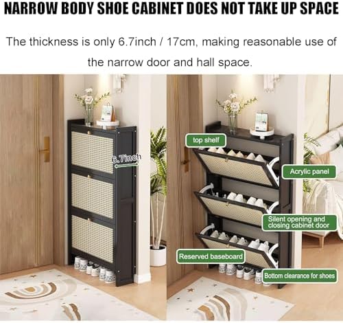 Enhance your home's entrance with our stylish and functional shoe cabinet, an ideal storage solution for your footwear collection. This elegant cabinet features three spacious drawers, providing ample space to keep your shoes organized and easily accessible. Its straightforward assembly process allows you to set it up in no time, making it perfect for busy households. Designed with a modern aesthetic and classic shape, this shoe cabinet with subtle gold accents effortlessly complements any living space—be it your entryway, hallway, living room, or porch. Crafted from premium bamboo and high-density board, this cabinet combines durability with a space-efficient design, making it the perfect addition for those looking to optimize storage without sacrificing style. This shoe cabinet not only offers practicality but also adds a touch of sophistication to your home decor. Imagine coming home after a long day and effortlessly storing your shoes in this elegant piece, keeping your space tidy and inviting. Whether you're a furniture enthusiast or simply seeking a functional storage solution, this cabinet meets your needs while enhancing your home's overall aesthetic. Specifications include: Material - bamboo and high-density board, Number of doors - 2 or 3 doors, Assembly required - yes, Suitable for - living room, hallway, study, or bedroom, Style - Modern. Package includes - 1 x Shoe Cabinet. Elevate your living space with this beautiful and versatile shoe cabinet today!