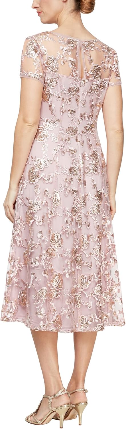 Elevate your special occasion wardrobe with this captivating S.L. Fashions Women's Cap Sleeve Tea Length Cocktail Dress. Perfect for wedding guests and cocktail parties alike, this dress features a timeless fit and flare silhouette crafted from luxurious satin soutache fabric with just the right amount of stretch. The embroidered lace detailing and illusion neckline add a touch of romance and sophistication, while the keyhole back opening provides a subtle hint of allure. Available in both petite and regular sizes, this versatile tea length dress flatters various body types. The cap sleeves offer stylish coverage, making it ideal for daytime and evening events. Whether you're attending a wedding or a formal gathering, this embroidered cocktail dress will ensure you look and feel your best.