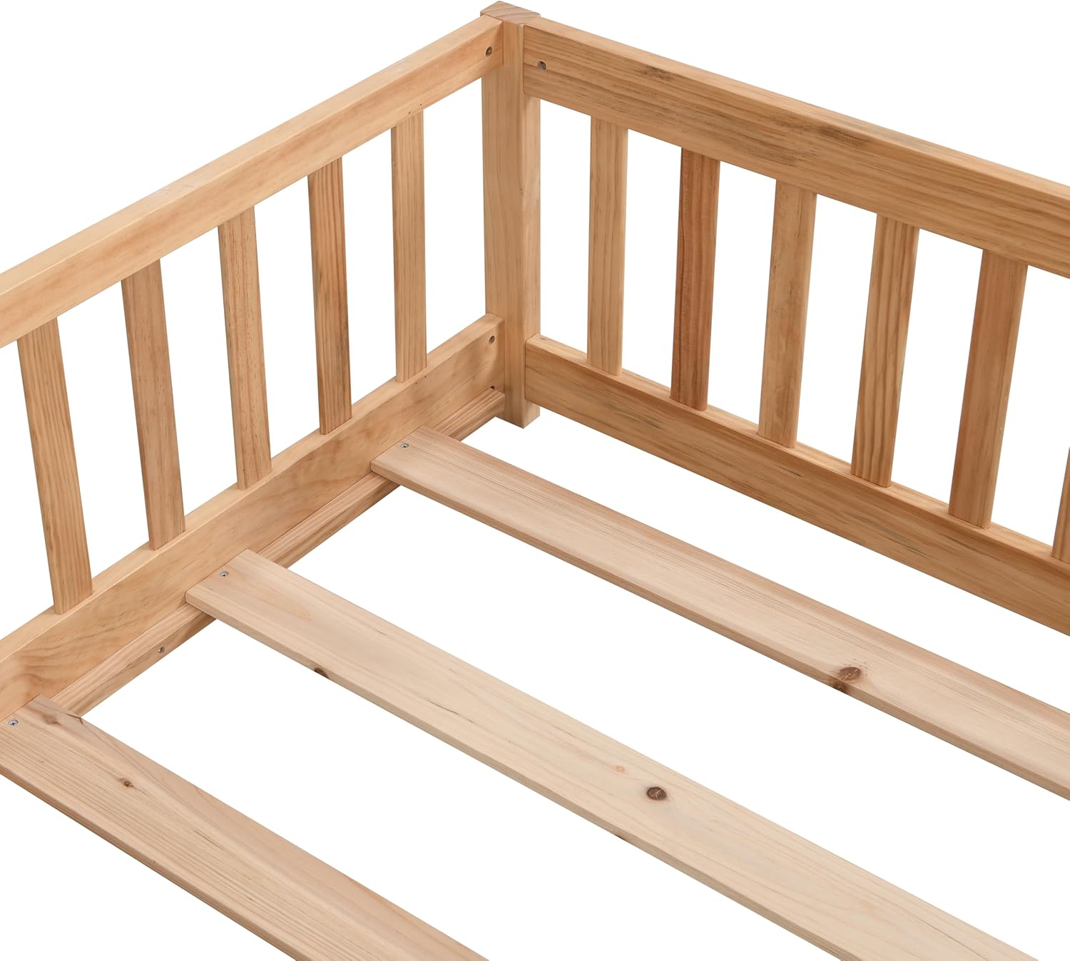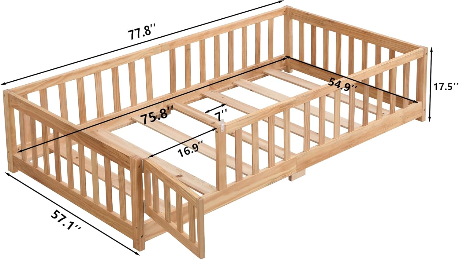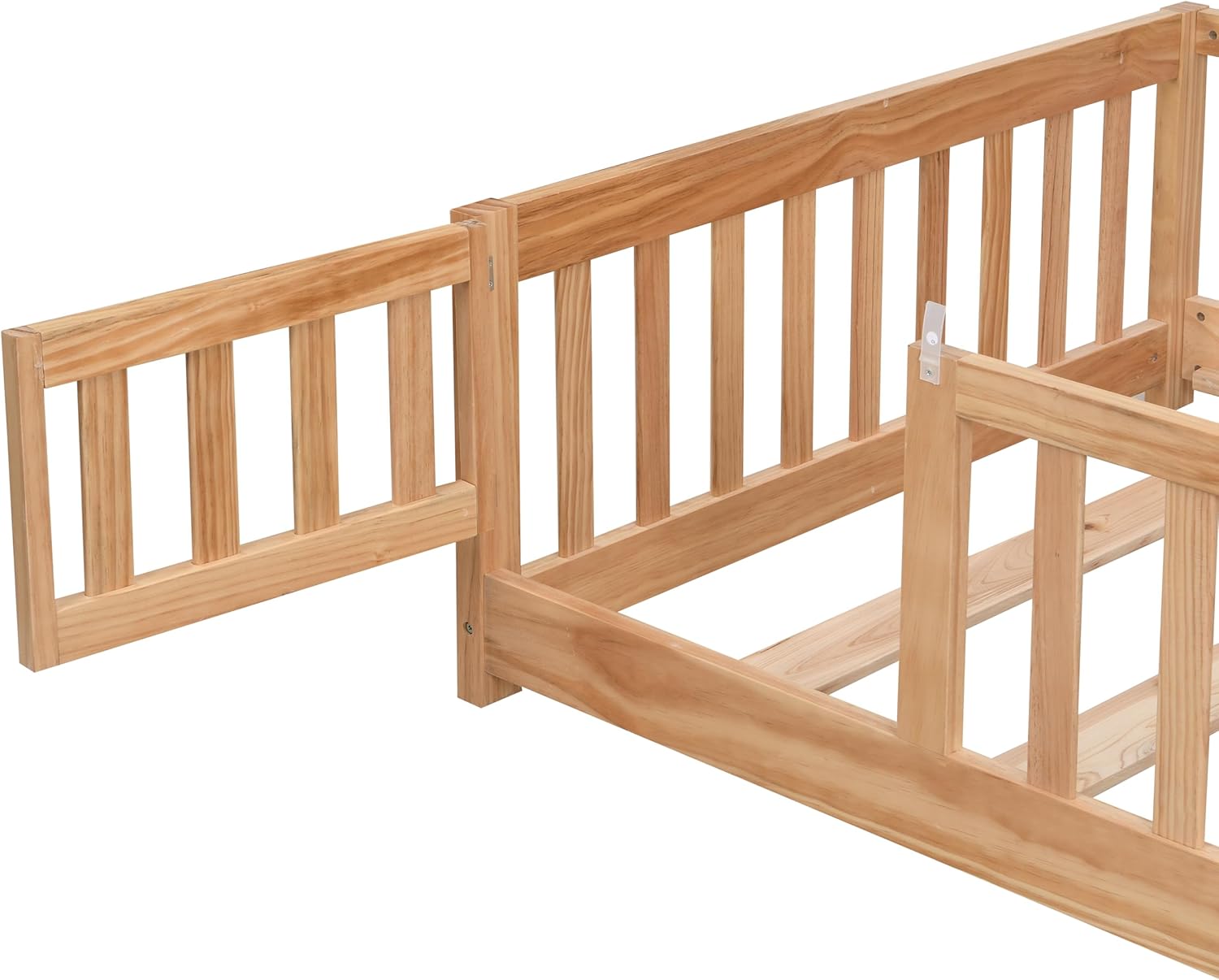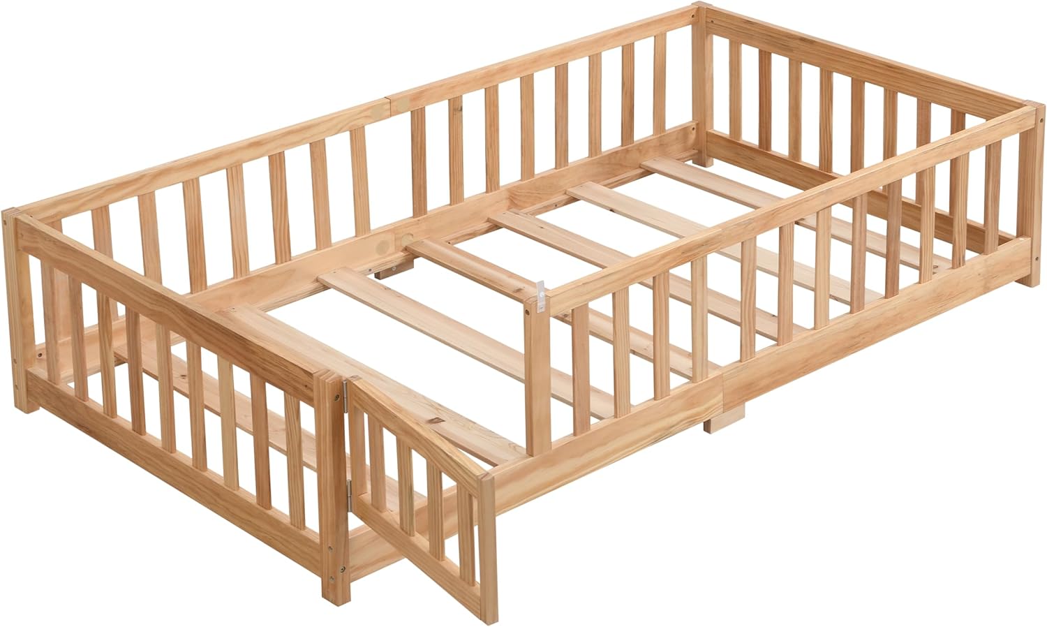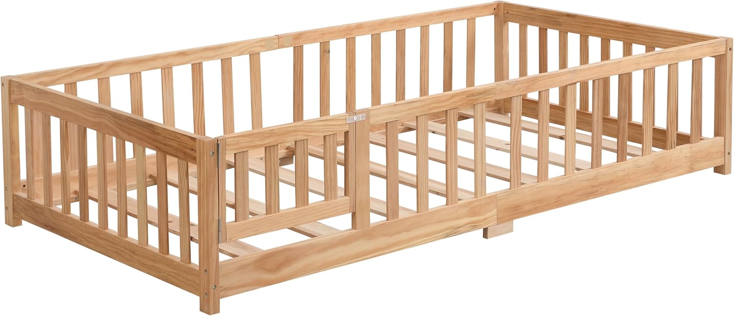 Give your child a safe, natural sleep space with this solid pine wood full-size floor bed. Featuring a low platform, protective fence, and a removable door, it fosters independence while falls. Ideal for Montessori rooms, it’s durable,-free, and easy to assemble. Mattress sold separately.