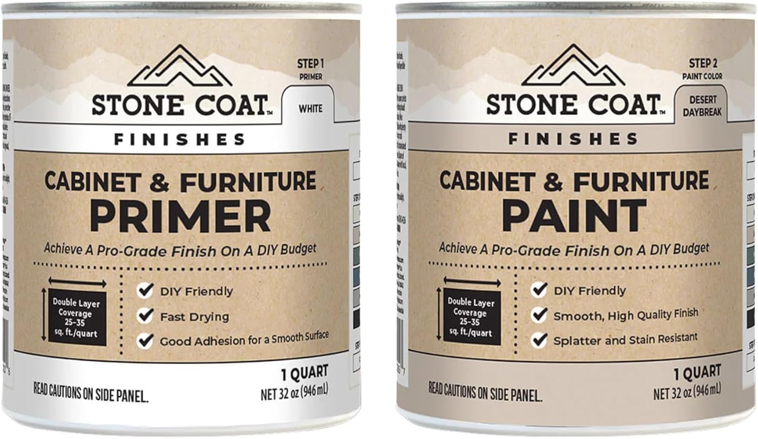 Transform your cabinets, doors, trim, and furniture with the Stone Coat Cabinet and Furniture Primer + Paint Bundle. Start with the Bright White primer, a high-hide, water-based acrylic formula designed to block wood tannins and previous paint colors, creating a smooth and durable base for your topcoat. Its self-leveling properties minimize brush marks and dry in just 1–3 hours, speeding up your project timeline. Follow with the Desert Daybreak paint, a durable, scratch-resistant acrylic finish with high adhesion and low VOC content. This versatile, neutral-toned paint provides a professional, long-lasting finish suitable for high-use areas like kitchen cabinets, bathroom vanities, and indoor furniture. Its easy application and quick-drying formula allow for a seamless DIY makeover without harsh odors or complicated steps. Perfect for DIY enthusiasts and professionals alike, this bundle ensures every project—from cabinets and doors to furniture and trim—achieves vibrant color, strong adhesion, and a smooth, flawless finish.
