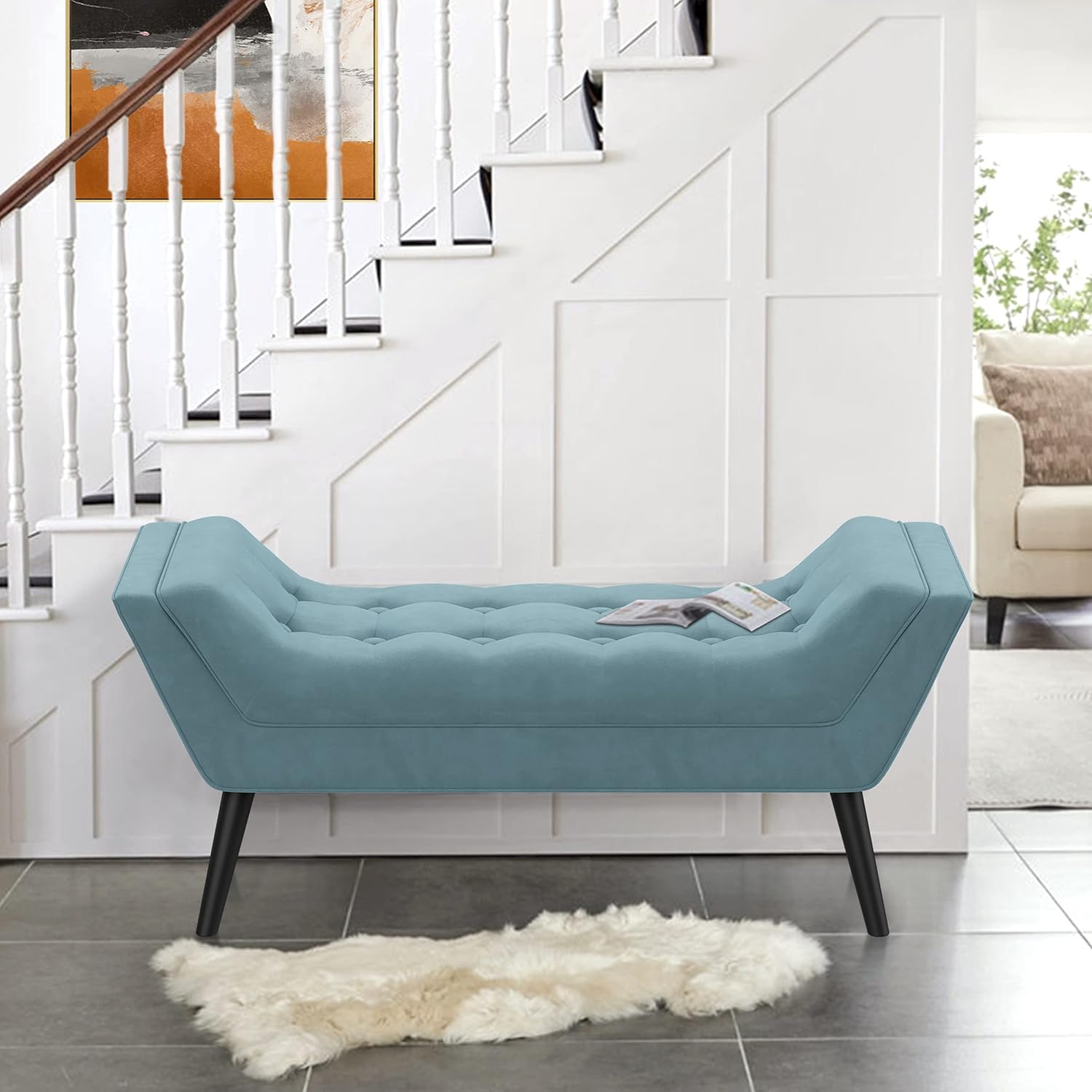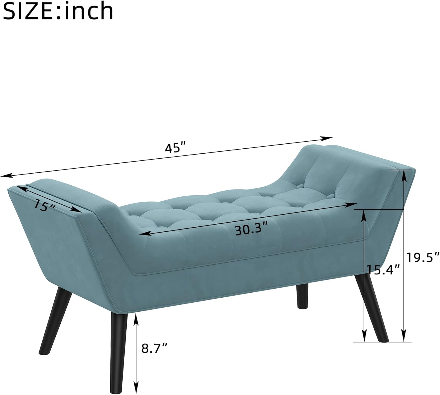 Apeaka Modern Button Tufted Bench for Bedroom/Living Room/Entryway/Hallway/Dining Room, Upholstered Velvet Bench Blue Fabric Specification: * Overall Size: 45"L * 15"D * 19.3"H * It is of modern style, can be greatly decorated your house. * It is suitable for any space of your home or entertainment, like bedroom, living room, dining room, entryway and hotel, also blends with a variety of decor. * Can be used in multiple room settings: as an ottoman, bench, coffee table, vanity chair, dressing chair, shoe stool. * The material of the bench is of good quality. It is soft and gives you comfortable seating experience. * Solid wood legs, keep them from sliding and scratching hardwood floors. Friendly Tips: * Please take note of the size when you place order. * There might be slightly different in color, because of the computer monitor settings. * Having any question about product and my company, we will be glad to help you.