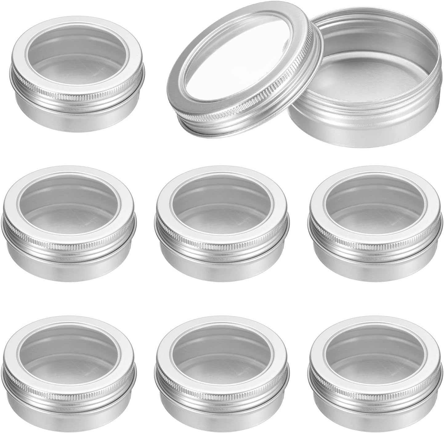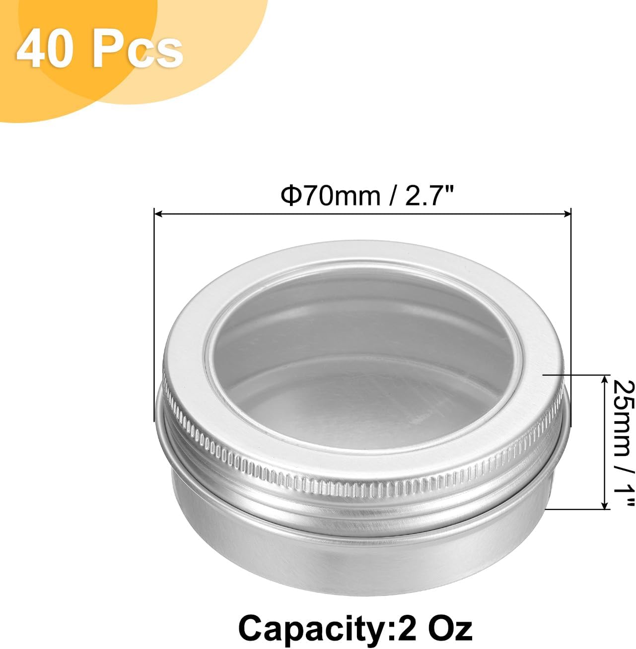 DescriptionMaterial: Made of aluminum, these containers are sturdy and durable, resistant to deformation or damage even with long-term use. Their compact design makes them convenient for travel or daily use.Secure Lid Design: round tin can with clear view window top, without opening the lid, you can quickly and easily find the items you need, durable and lightweight, convenient for using, these containers are easy to open and close, providing excellent sealing performance to prevent leaks.Smooth Surface: The round screw-top containers have a smooth surface and seamless design with rounded edges that are safe and convenient to handle. They are suitable for carrying in pockets or handbags.Versatile Use: These empty aluminum cans can be widely used for making candles or storing DIY products such as balms, lotions, creams, beard wax, fragrances, samples, tea, beads, etc., catering to various needs. They are also essential for travel.Easy to Use: Simply unscrew the cap, place your items inside, and tighten the lid to ensure a secure seal. You can label them accordingly for easy identification of different contents.Caution: As these containers are made of aluminum, avoid prolonged contact with acidic or alkaline substances.SpecificationMaterial: AluminumColor: SilverSize: 68 x 64 x 25 mm / 2.7 x 2.5 x 1 inch(OD x ID x H)Capacity: 2 OzPacking Include: 40 Pcs x Tin Cans